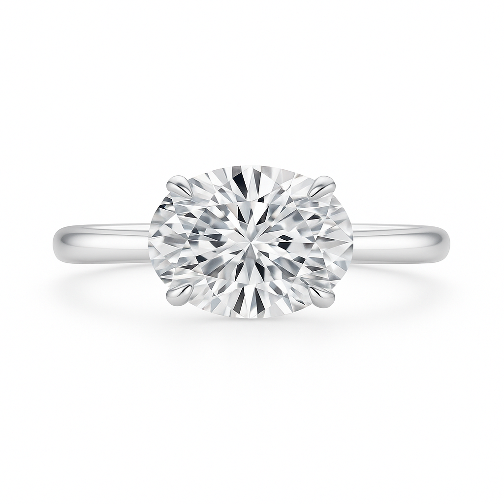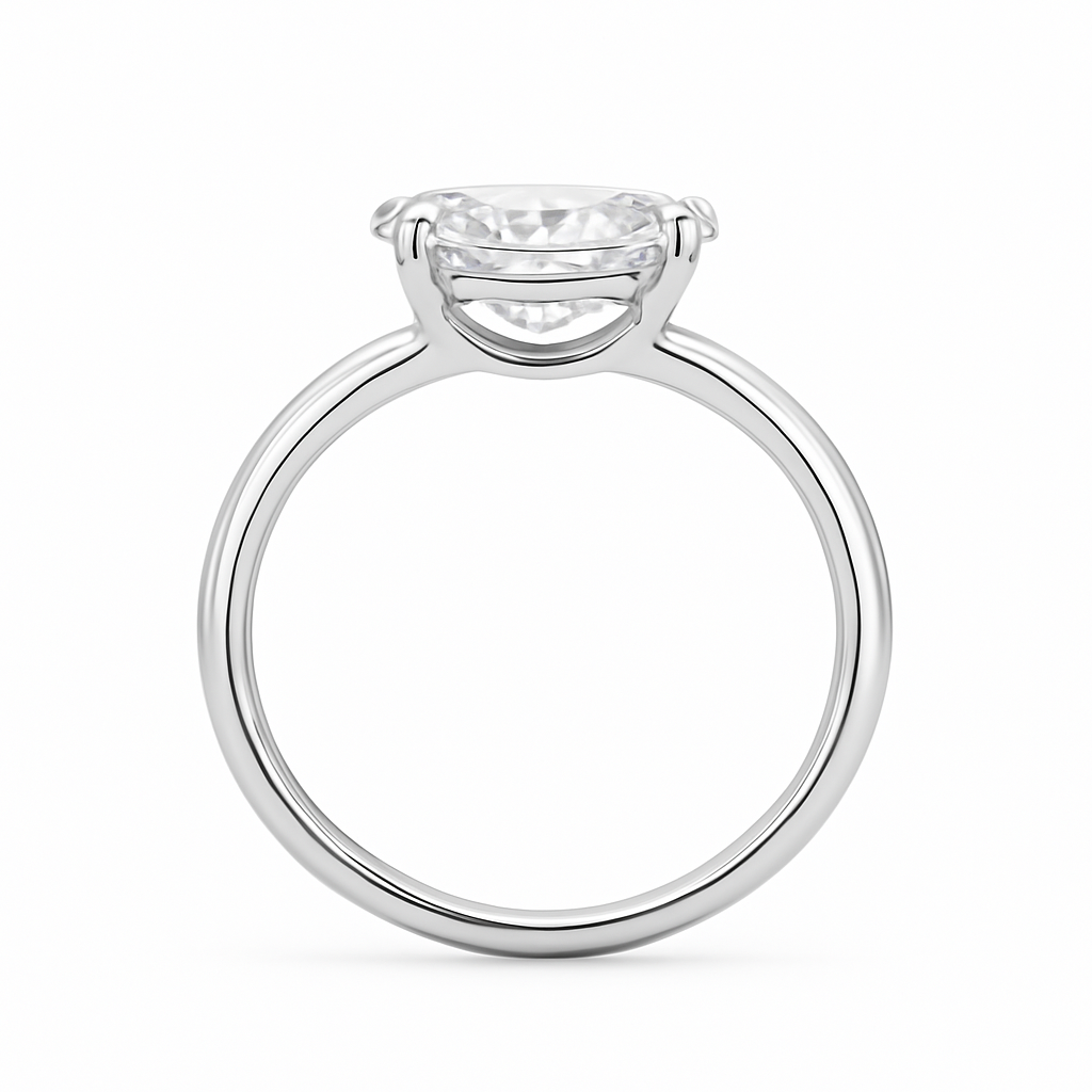 Anne is a quietly radical take on the solitaire. At its centre: a luminous 2ct oval stone, set east-west to follow the natural line of the hand. The effect is subtle but unmistakable—modern, assured, and refreshingly unconventional. The band is left bare, deliberately so, allowing the elongated stone to speak for itself.