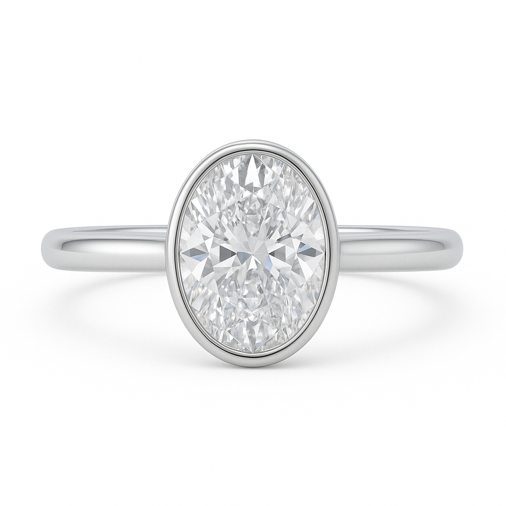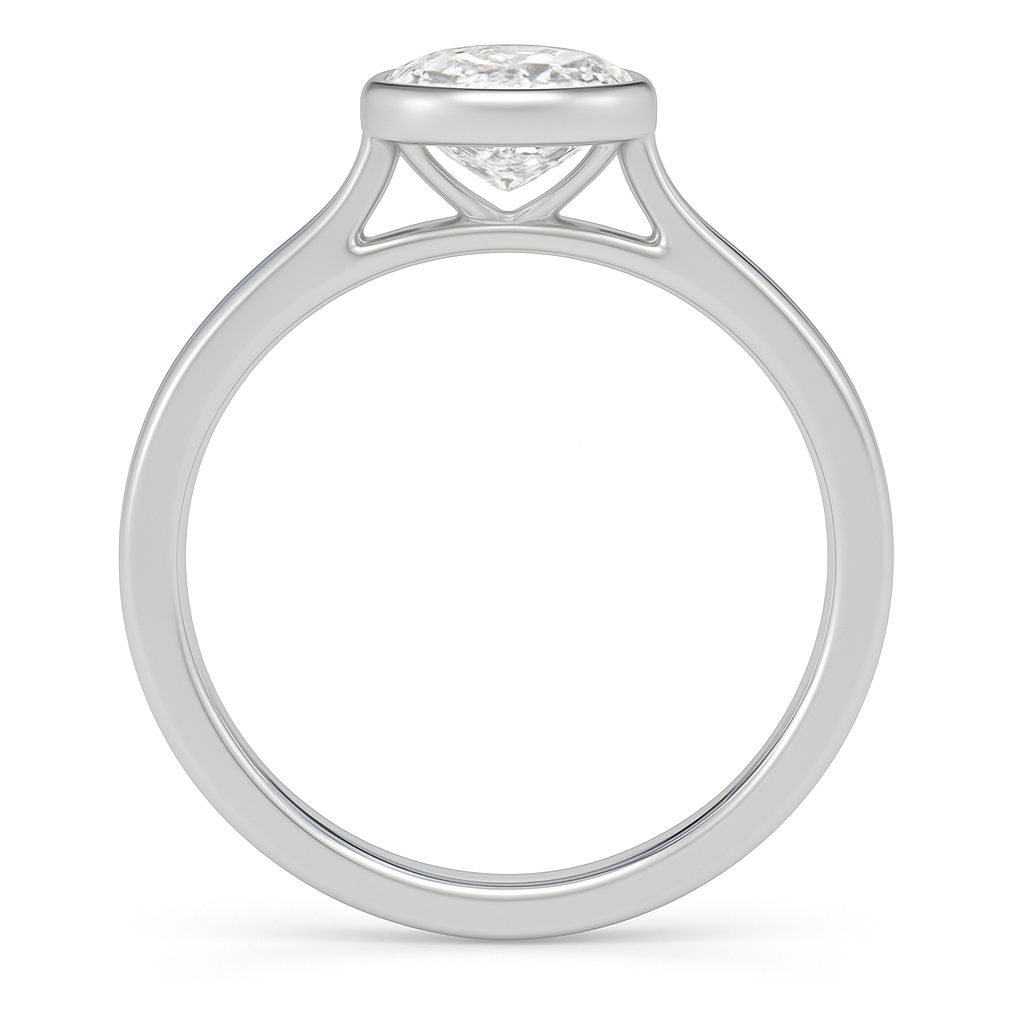 Graceful, intentional, and quietly bold — the Irene ring is a lesson in restraint. At its center rests a bezel-set 2ct stone, encased in a smooth band of precious metal that offers both protection and polish. The setting enhances the stone’s natural brilliance while lending the piece a distinctly modern silhouette.