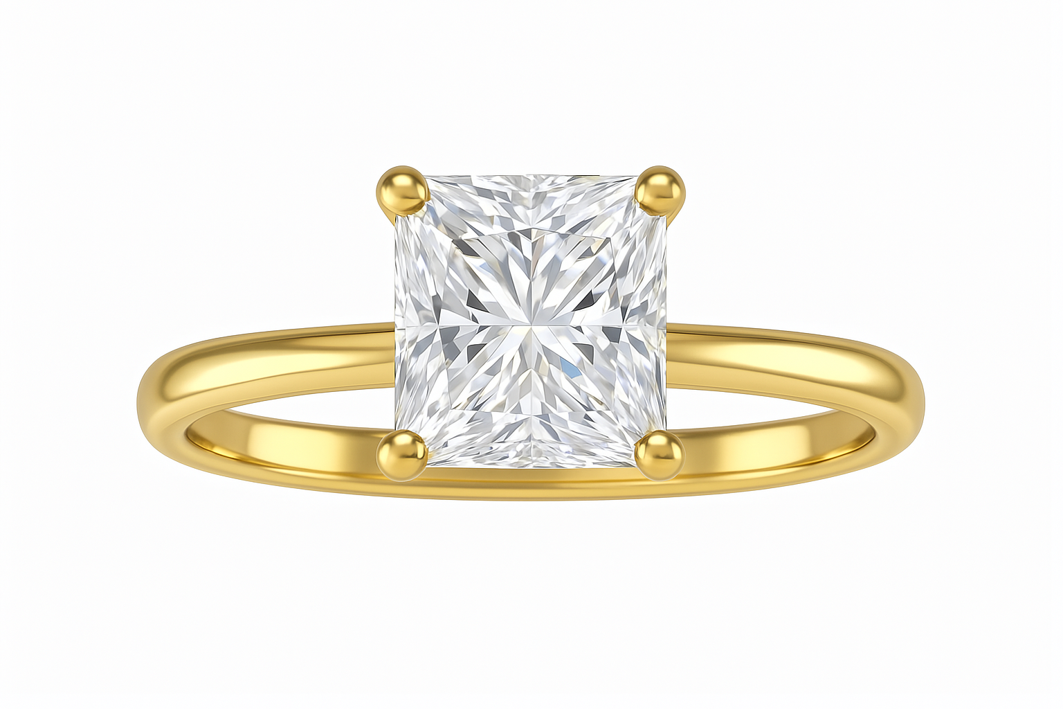 The Athena Ring radiates timeless elegance, featuring a captivating 2.5ct princess cut solitaire that reflects the light with effortless brilliance. Set in a classic four-prong design, it offers a graceful and enduring silhouette that never goes out of style.