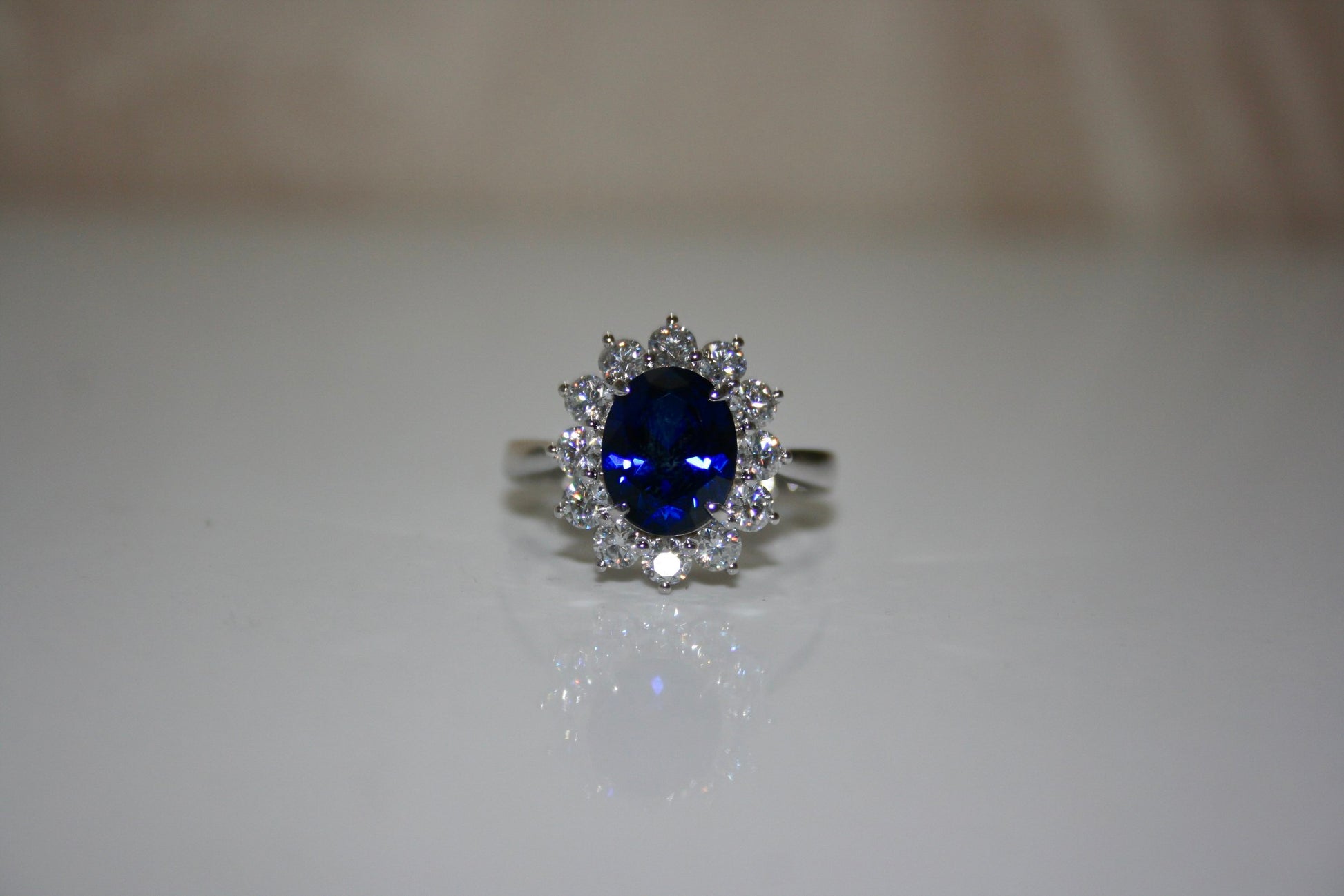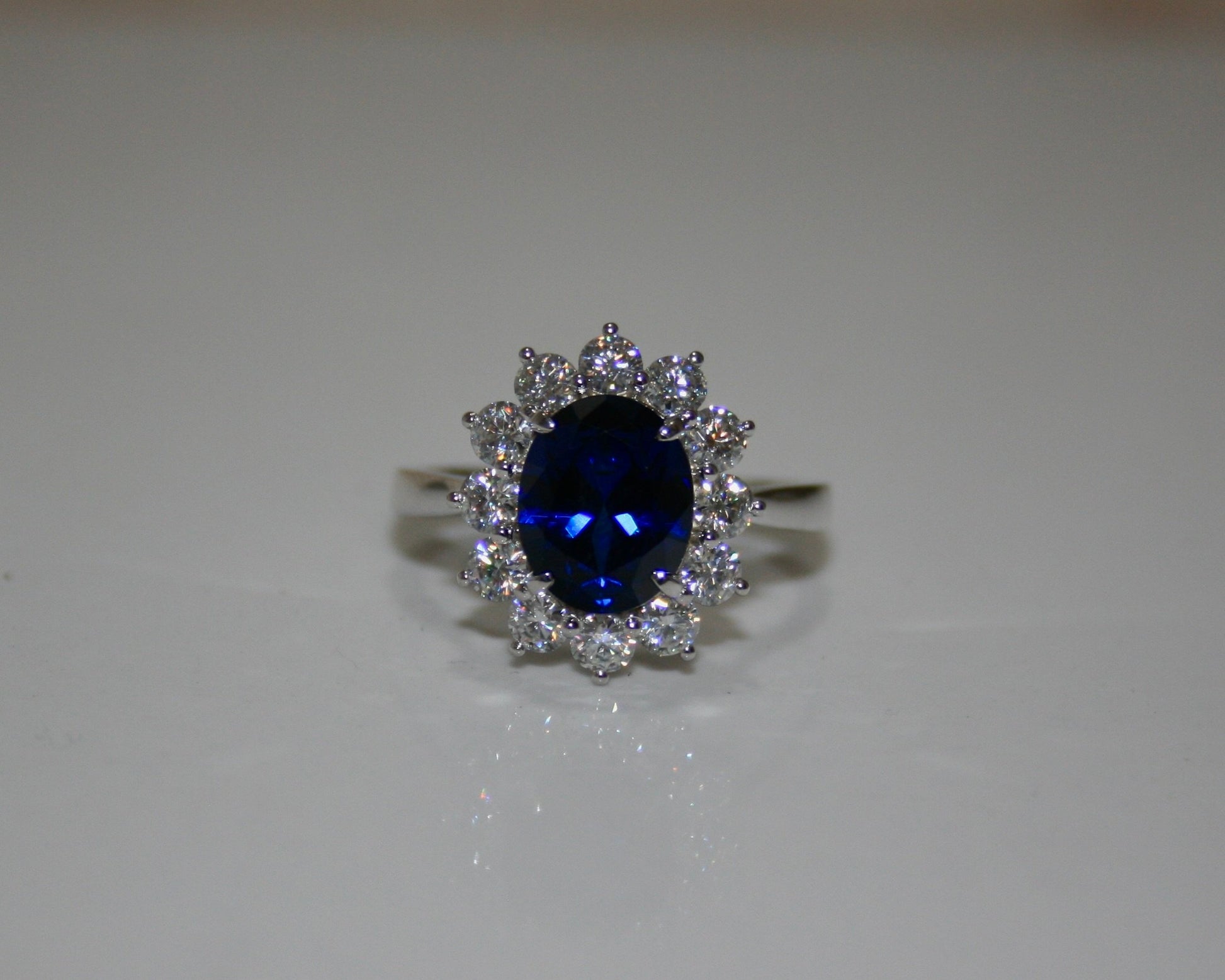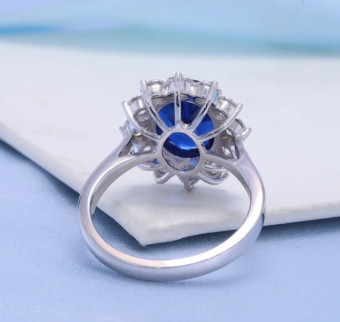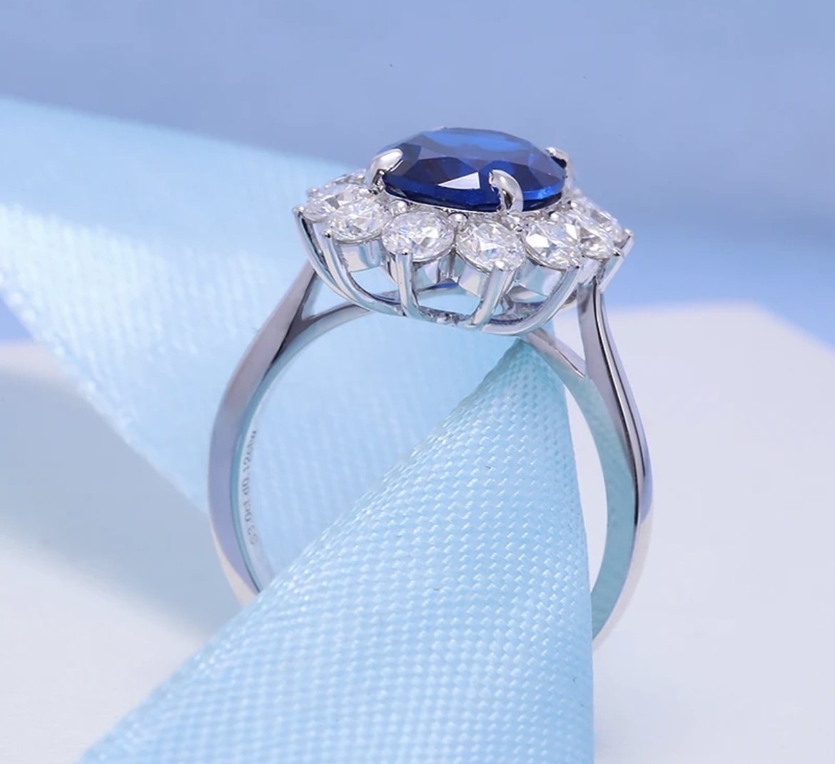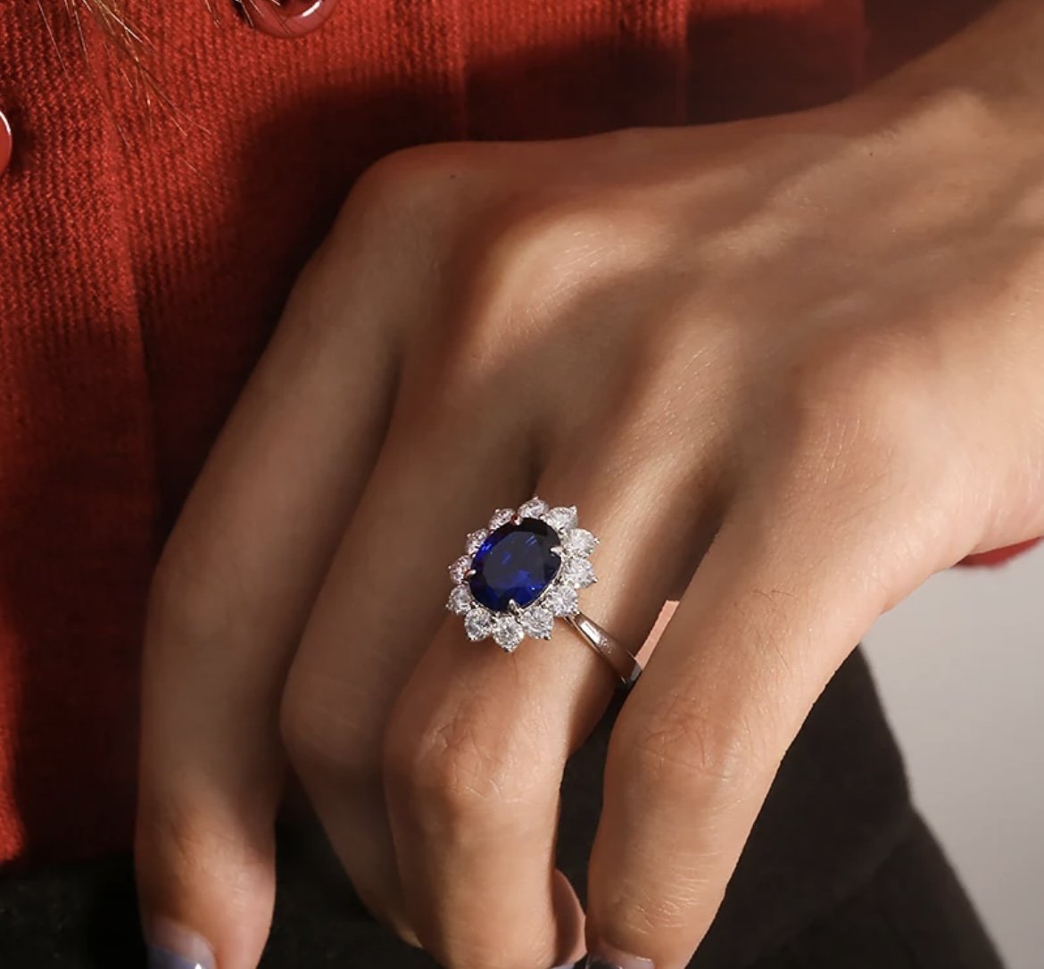 The Azure ring is a modern take on a classic design, with a striking 8x10mm lab grown sapphire centre stone and a halo of dazzling moissanites. Reminiscent of the ring worn by Princess Diana, the Azure ring is ideal for anyone searching for a more unique, coloured engagement ring, or a stylish cocktail ring ideal for any formal events. . The deep blue of the sapphire is striking and elegant, while the brilliant sparkle of the moissanite adds a touch of modernity and sophistication. This ring represents the perfect balance of timeless beauty and contemporary style.