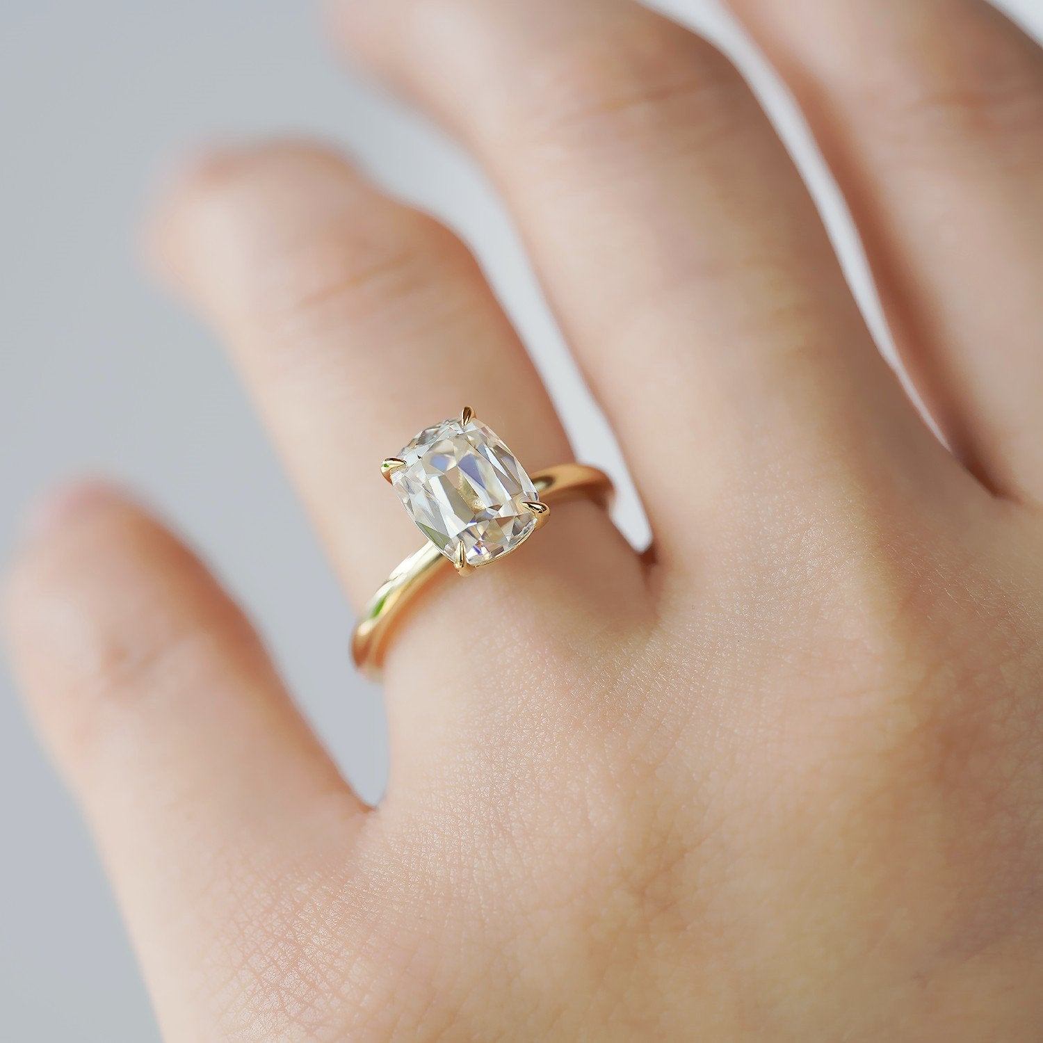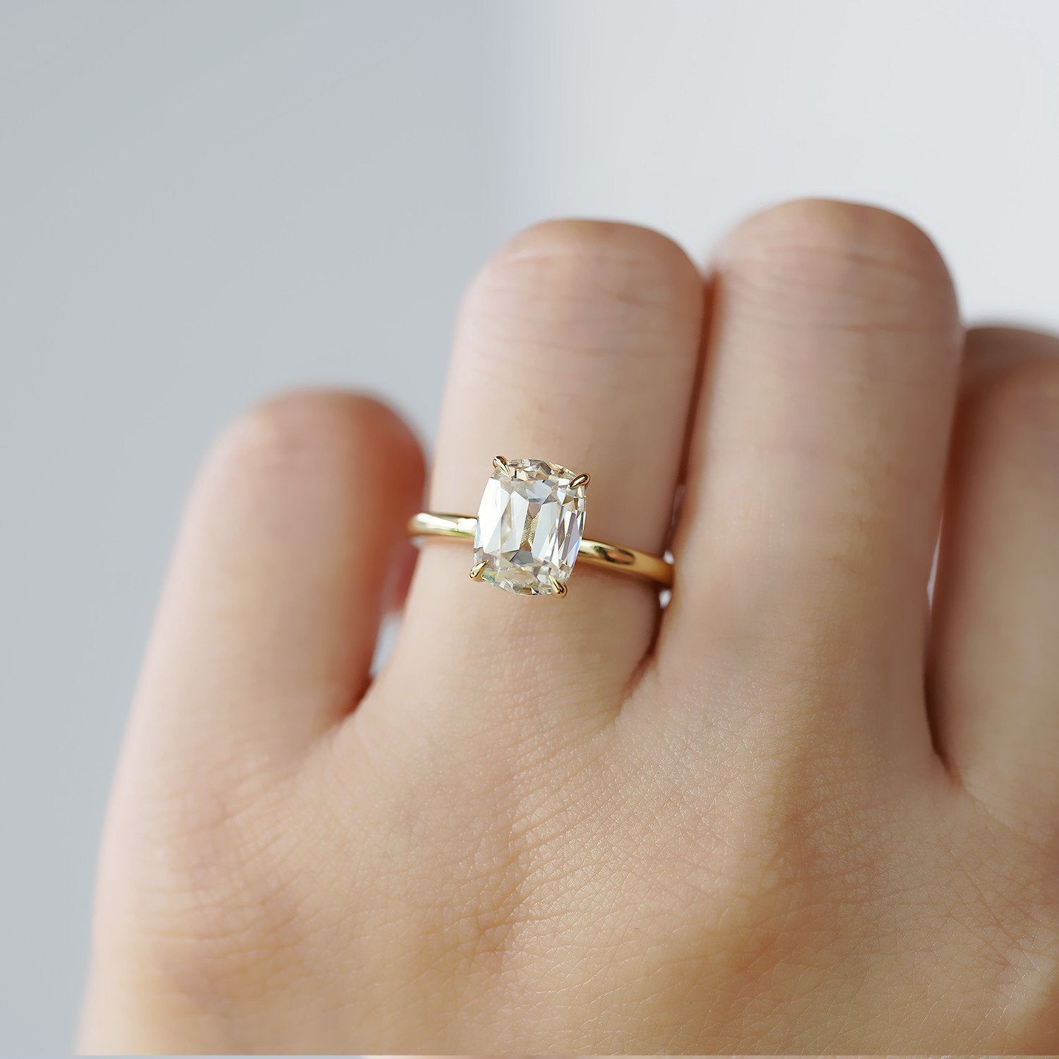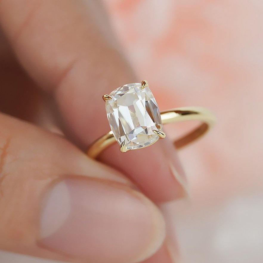 Our Bella ring is a stunningly designed 2ct old mine cut engagement ring, available in both diamond and moissanite. Expertly crafted with the finest quality stones and cutting techniques, the old mine cut is a rare and unique shape that enhances the brilliance of both materials—especially moissanite.