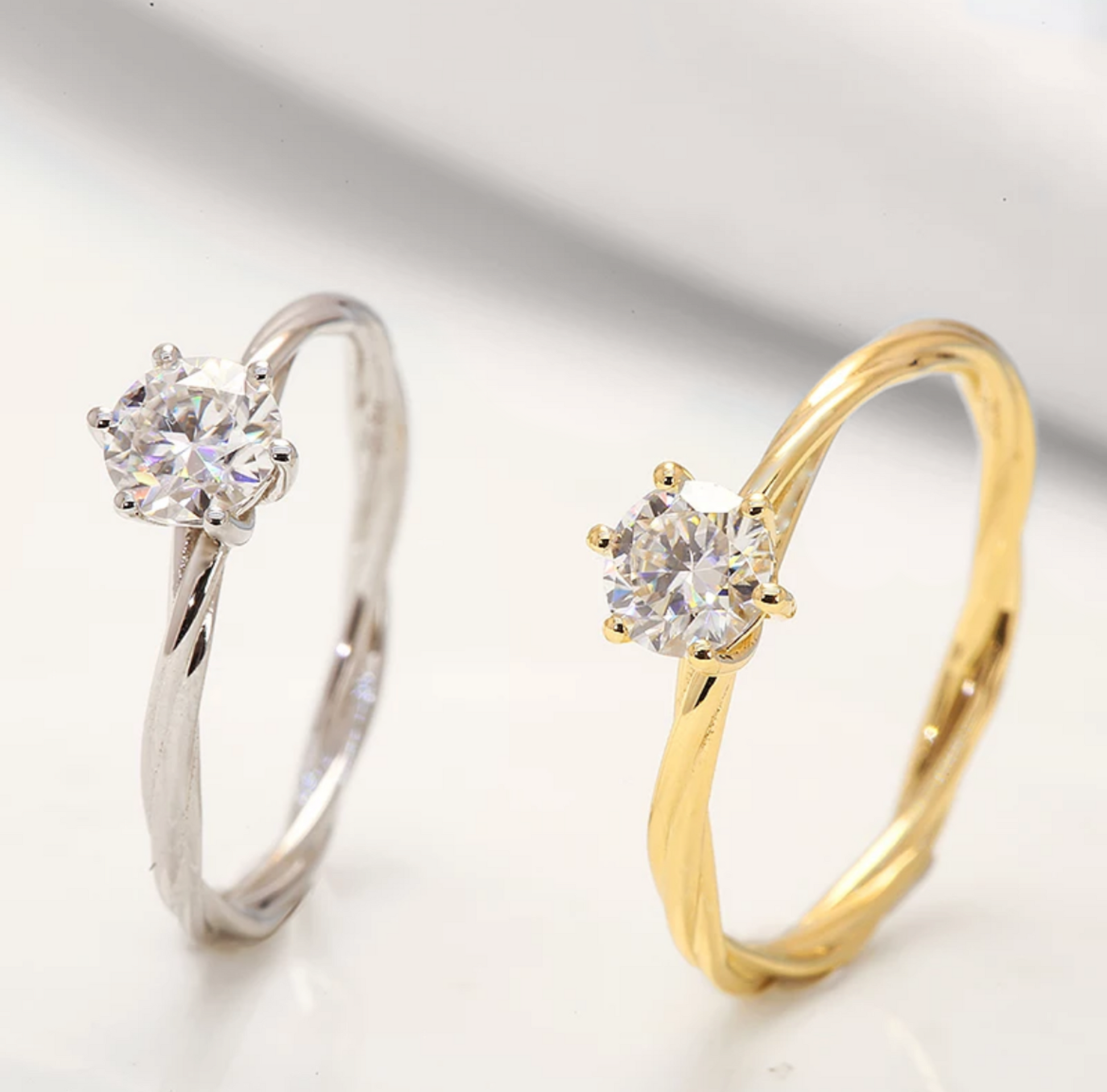 A captivating 0.5ct stone takes centre stage, elegantly perched on a beautifully twisted band that adds a romantic, sculptural touch.