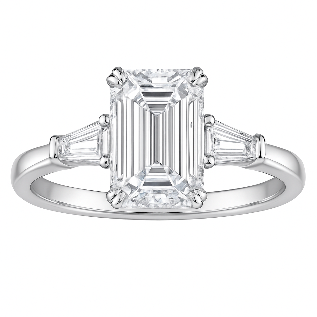 The Celestine ring is a timeless trilogy design, centered around a mesmerizing 2-carat emerald-cut stone that exudes sophistication and grace. Flanked by tapered baguette side stones, this classic arrangement highlights the beauty of each stone, creating an exquisite balance of elegance and brilliance. The Celestine ring is a perfect choice for those who appreciate refined luxury and enduring style.
