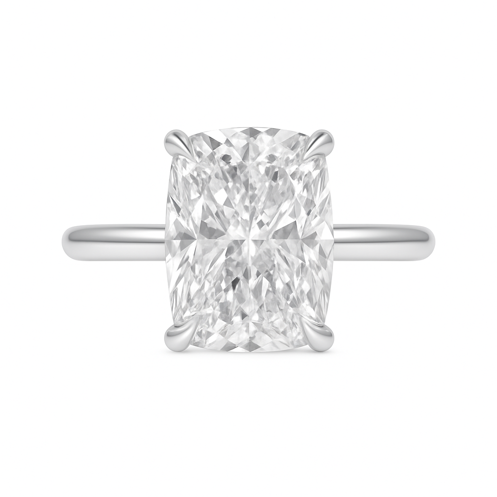 The Christine ring is a study in refined elegance, showcasing a striking 3ct elongated cushion-cut center stone. Set in a sleek, unadorned band, its beauty is accentuated by the purity of clean lines and a classic four-prong setting. Beneath the surface, a hidden halo lends a subtle touch of brilliance, creating a quiet glow that enhances the stone without distraction. Timeless yet contemporary, the Christine ring is designed for those who seek sophistication in its most graceful form.