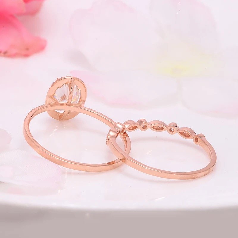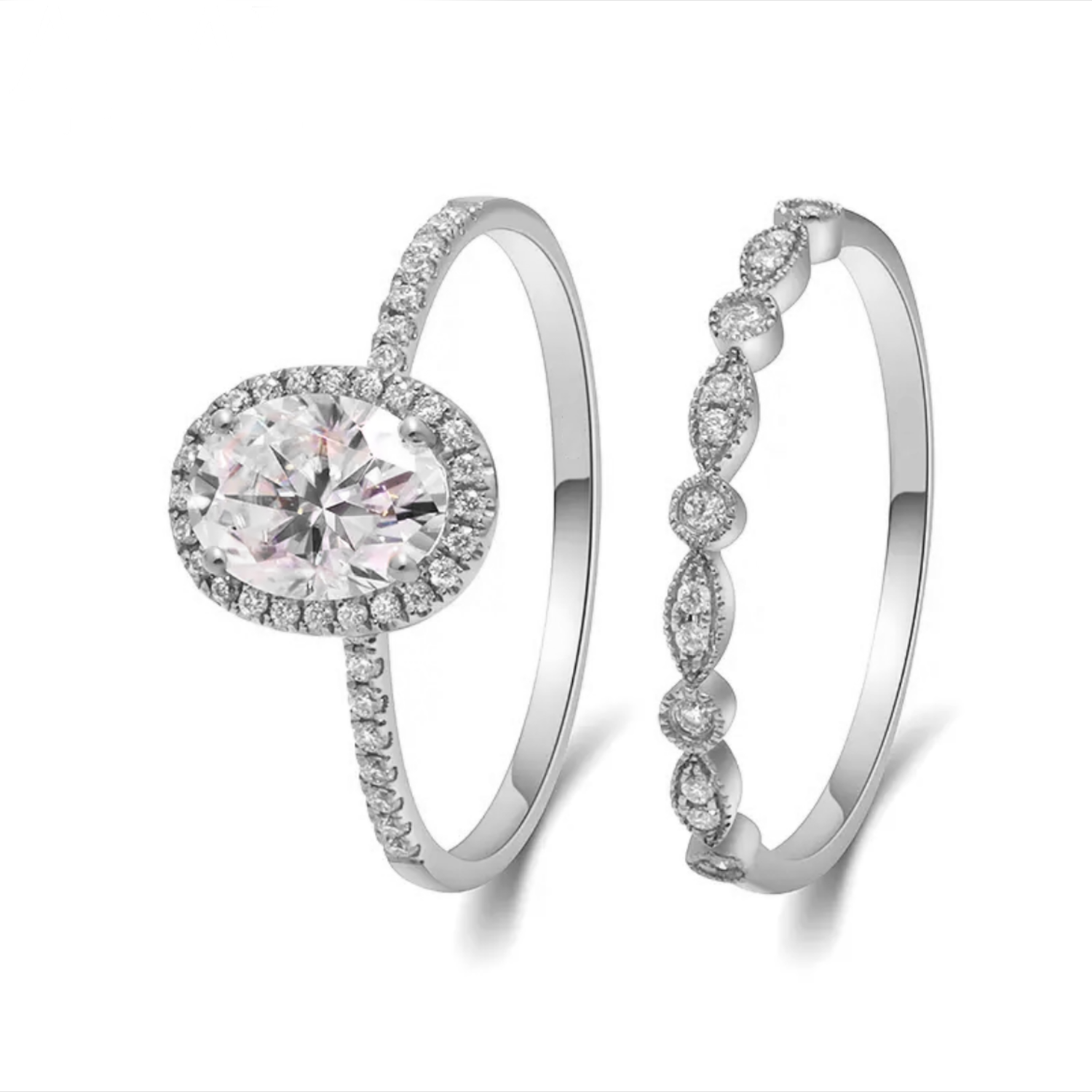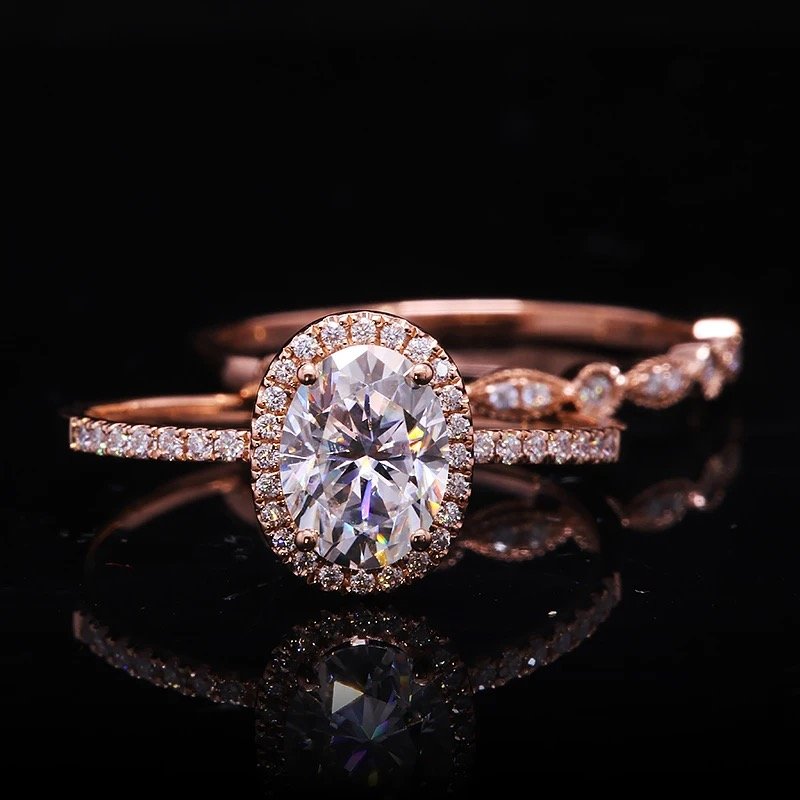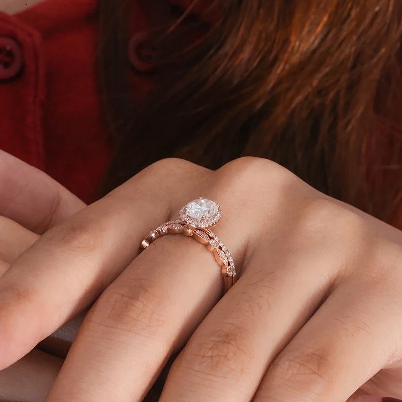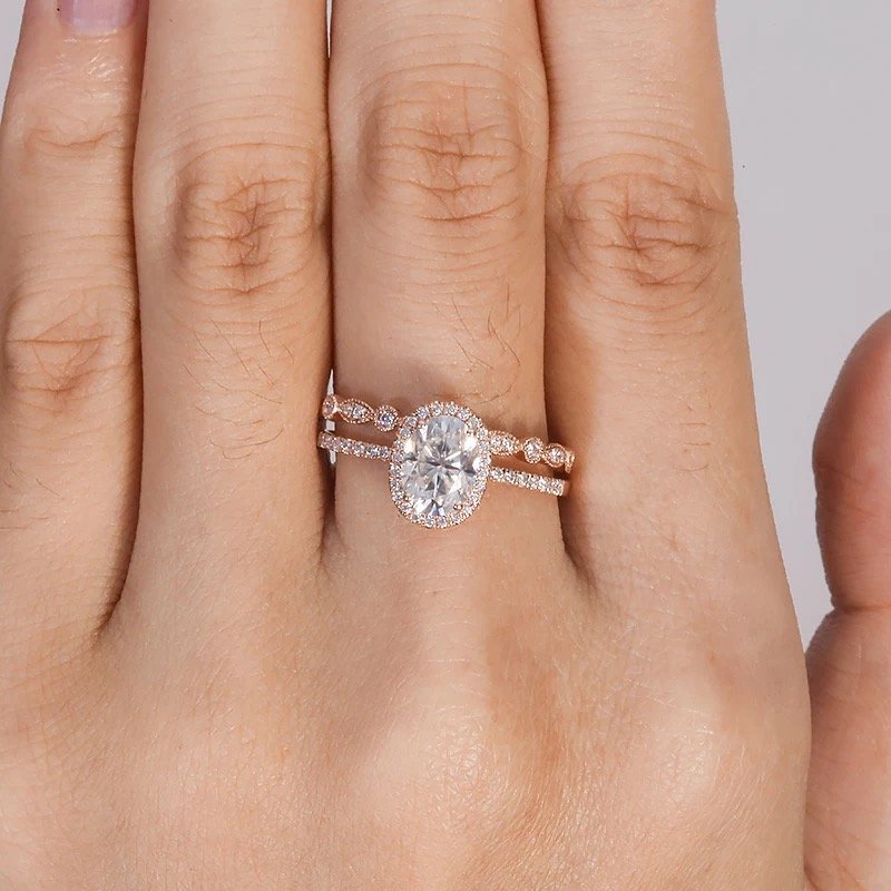 The Cicely set is the ultimate embodiment of romance and eternal love. The engagement ring features a breathtaking 1.5ct Oval D Colour Moissanite stone, surrounded by a halo of smaller stones that shine like the stars in the sky. The band is delicately crafted with intricate details that harken back to a bygone era, while still feeling fresh and modern. The wedding band is designed to perfectly complement the engagement ring, with a dainty and timeless design created with smaller moissanites. Together, the Cicely set is a stunning and unforgettable symbol of love and commitment.