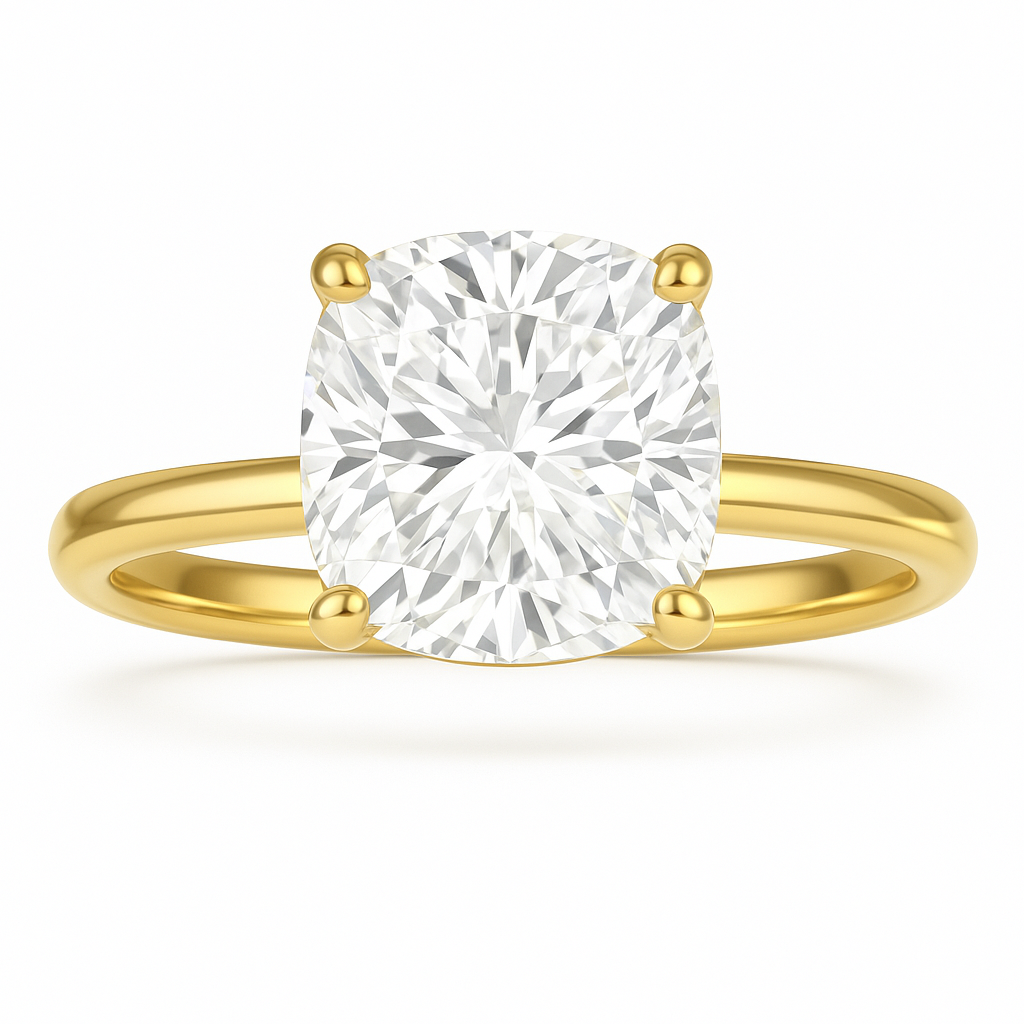Introducing the Cora Ring — a timeless embodiment of refined elegance. At its heart lies a radiant 2.5ct cushion-cut stone, celebrated for its soft edges and captivating brilliance. Set in a classic four-prong setting, the stone is elevated with intention, allowing light to dance across every facet.