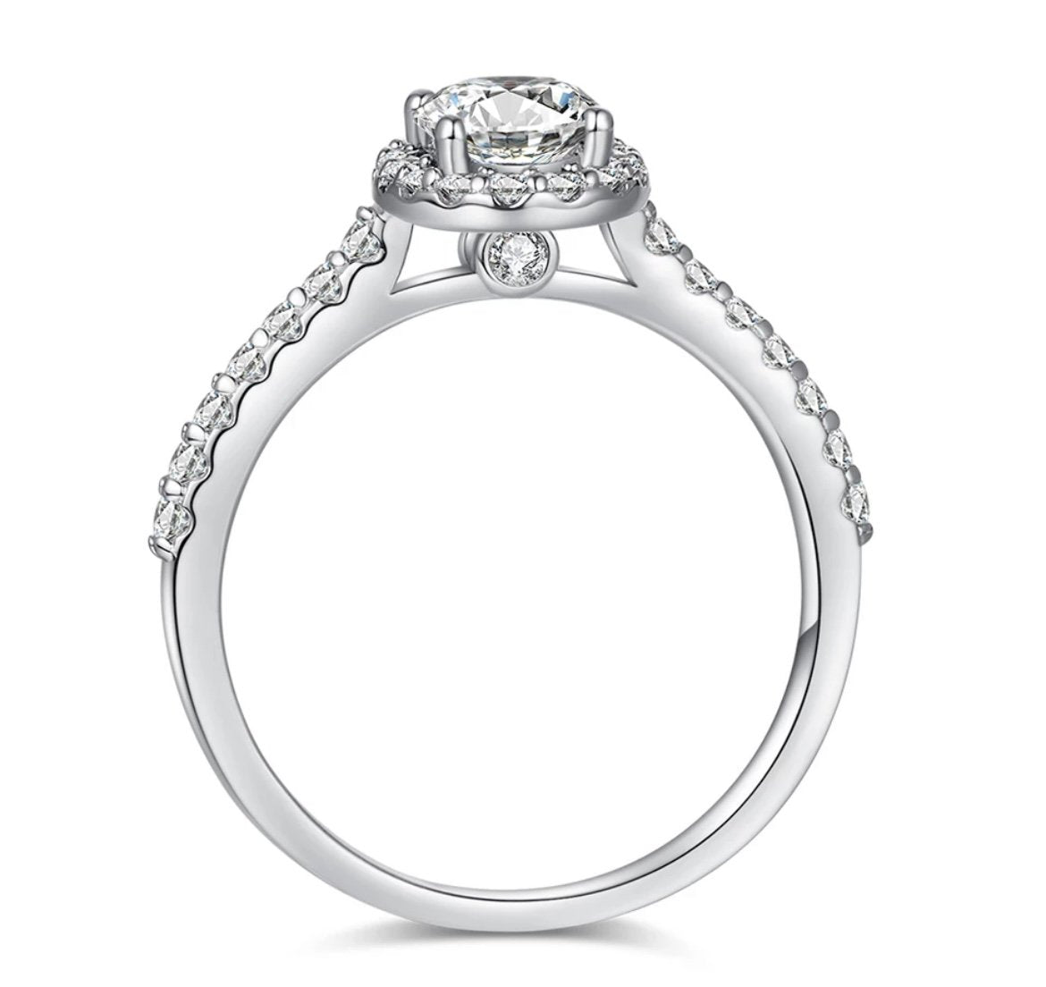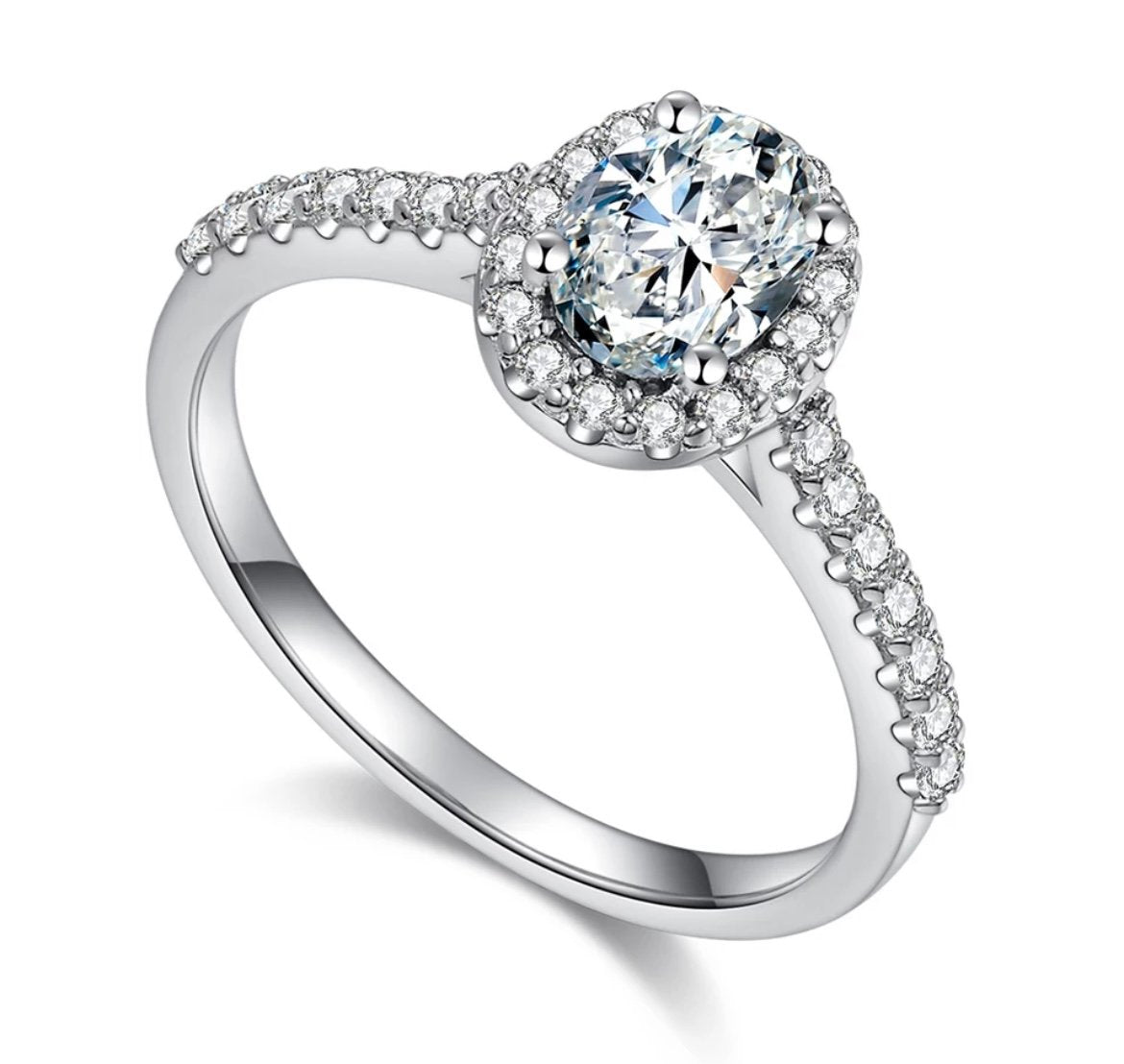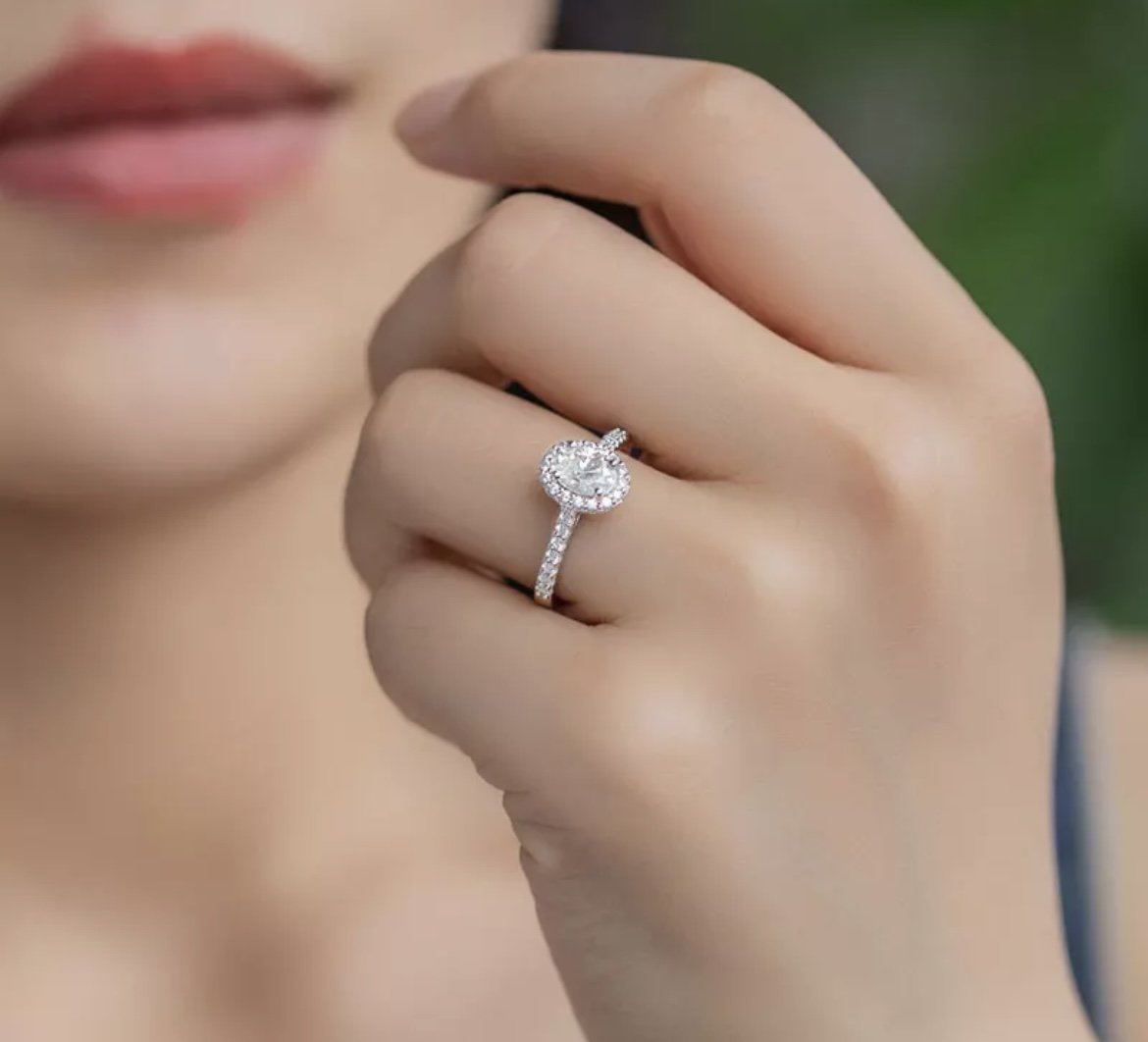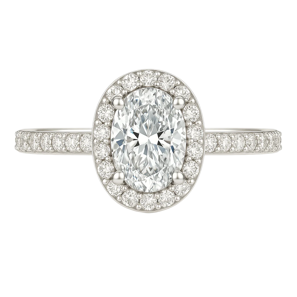 The Edunia Ring is a truly captivating piece, designed to take your breath away. At its center sits a radiant 1ct D-color oval-cut stone, encircled by a delicate halo that enhances its brilliance from every angle. A pavé-set band adds a subtle shimmer, bringing a refined touch of glamour to this timeless design.