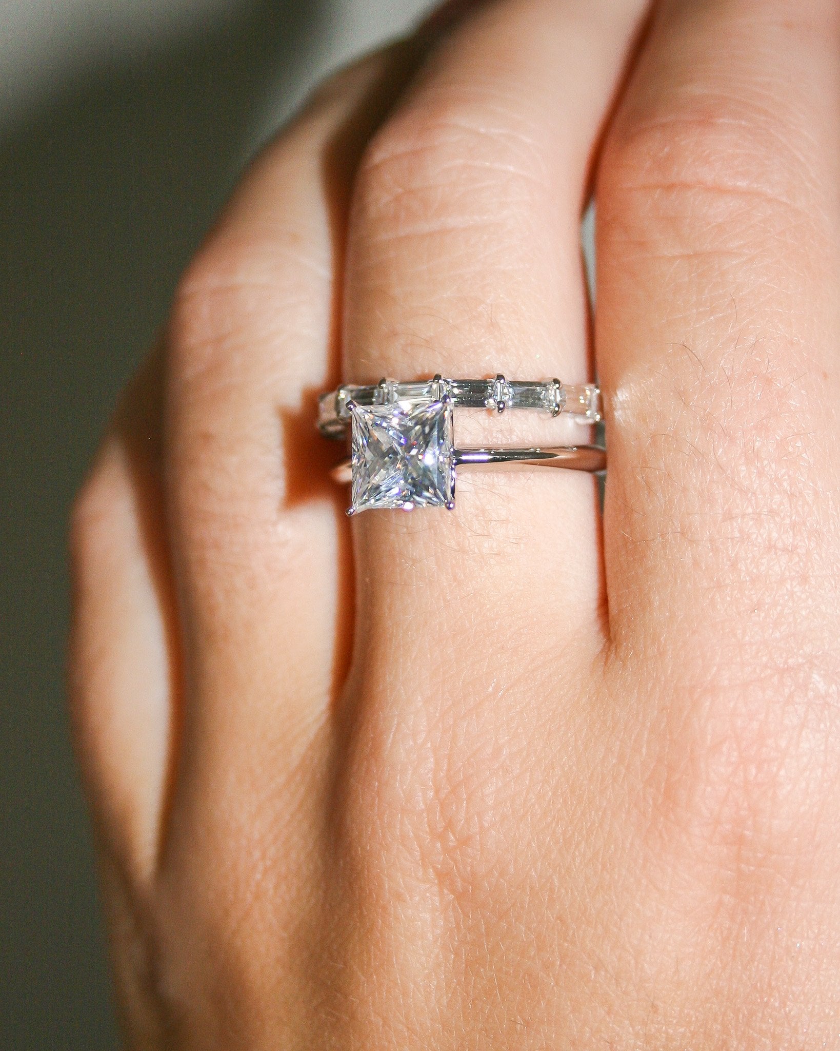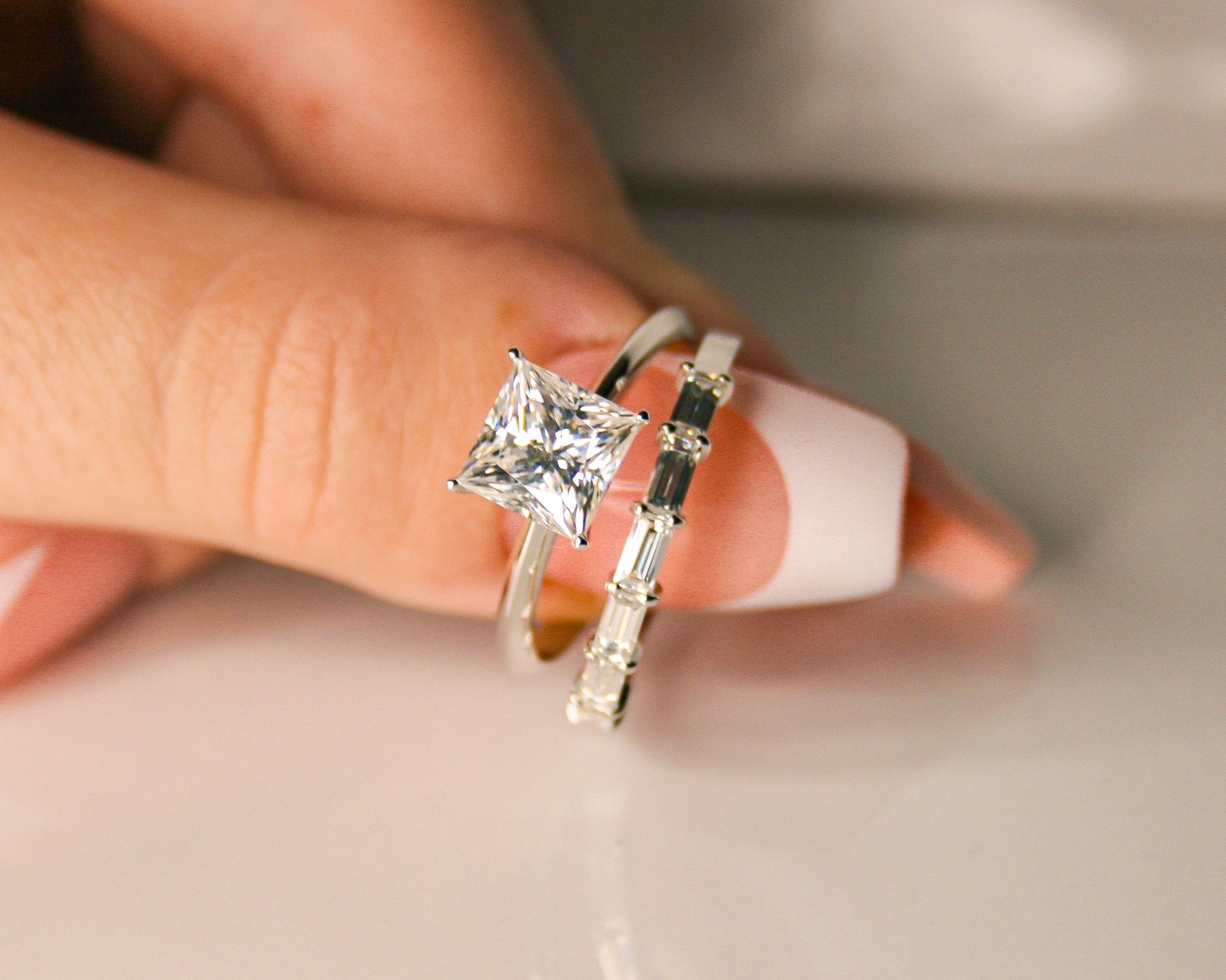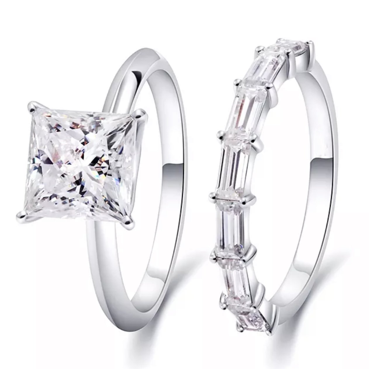Our Ember Bridal Set is a bold yet timeless pairing designed to celebrate love in its most radiant form. The engagement ring features a striking 2ct princess-cut center stone, set in a sleek four-prong setting that lets the brilliance of the cut shine through with modern elegance.