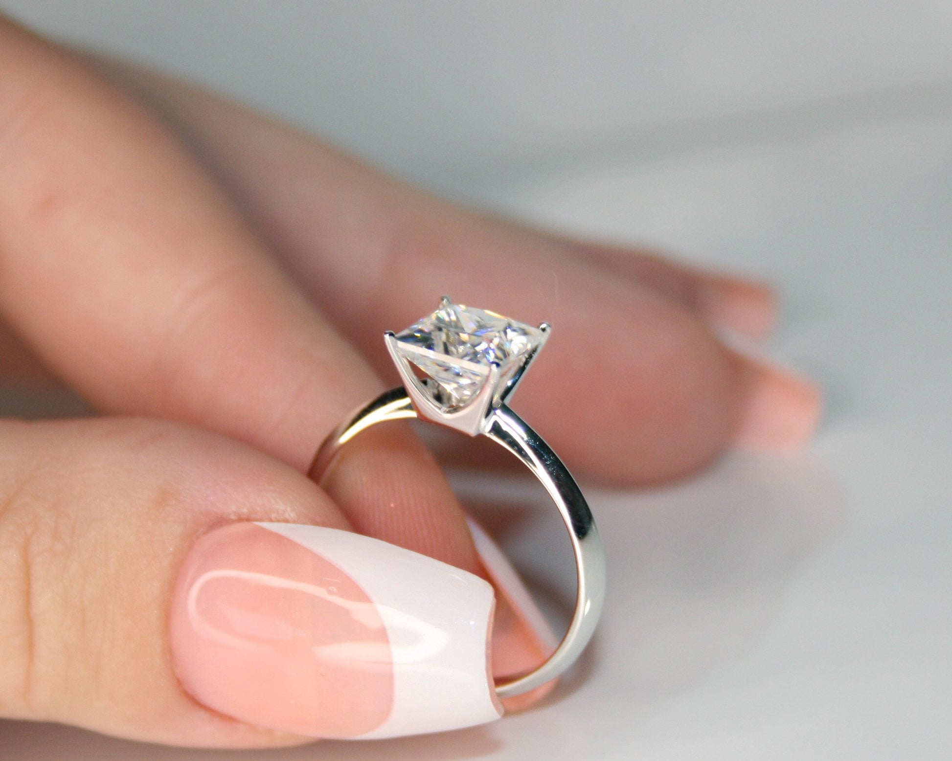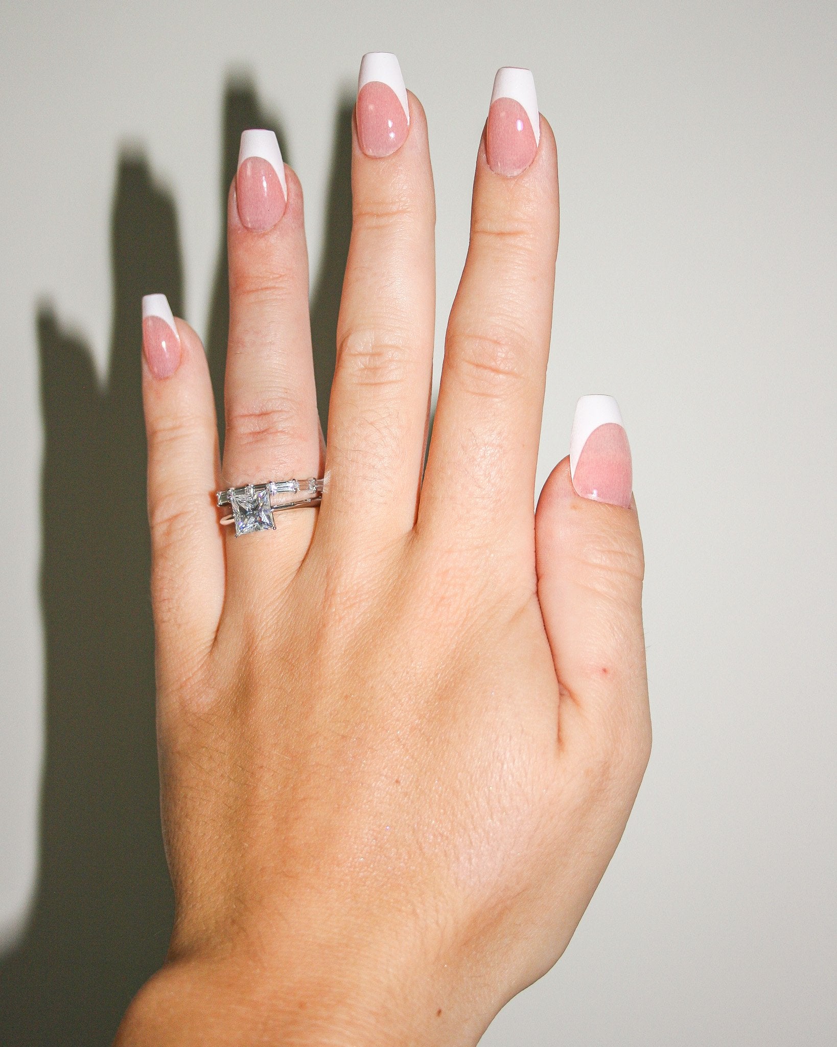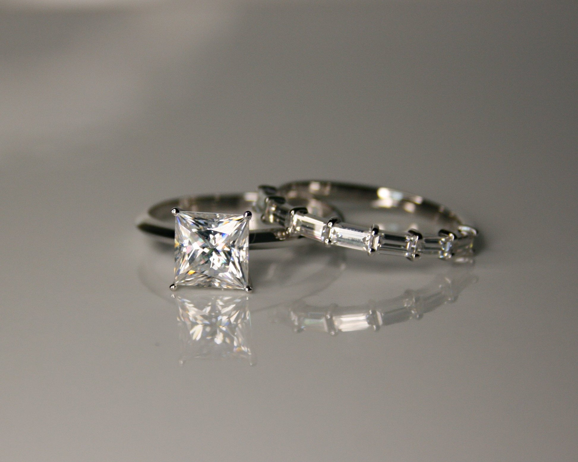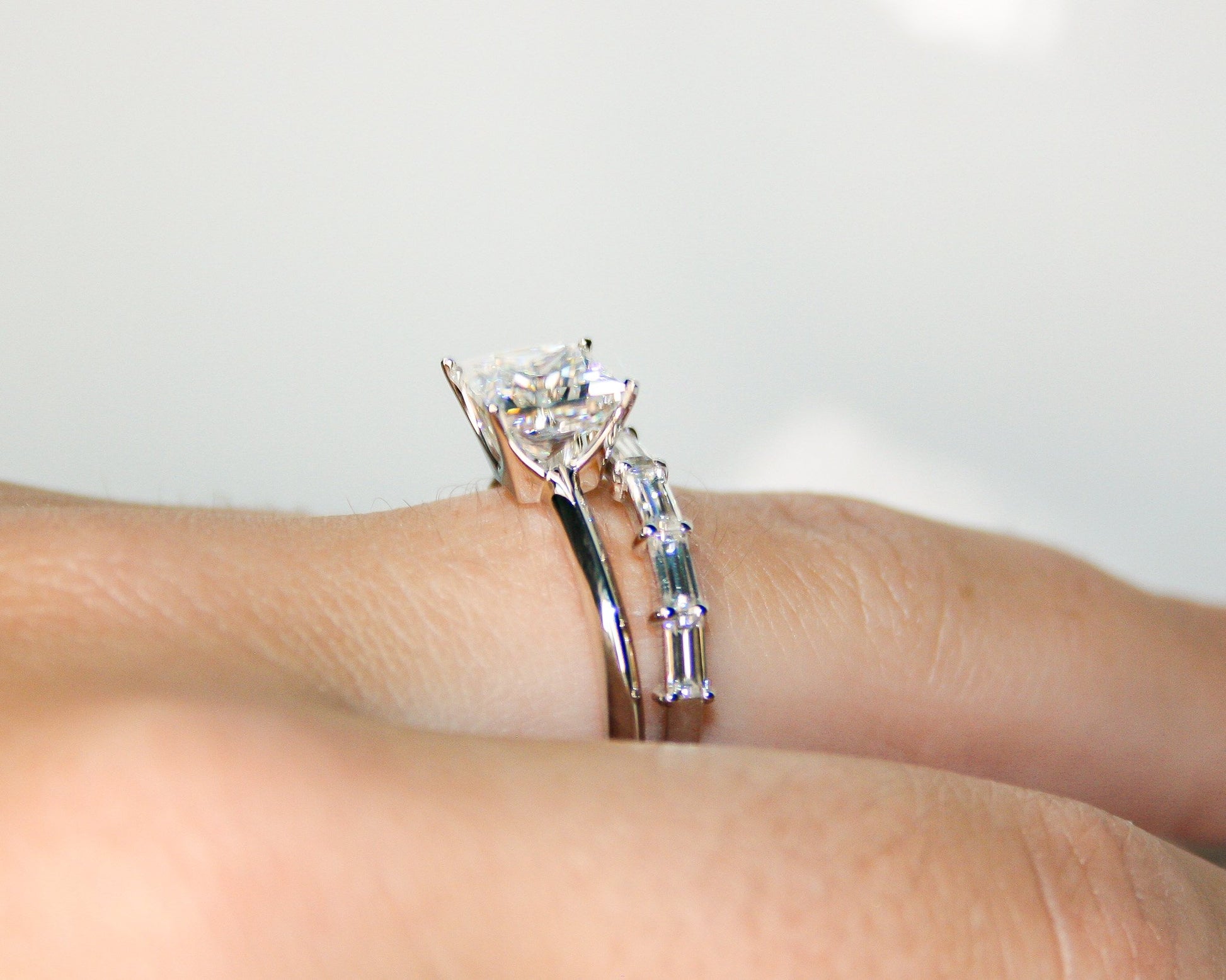 Our Ember Bridal Set is a bold yet timeless pairing designed to celebrate love in its most radiant form. The engagement ring features a striking 2ct princess-cut center stone, set in a sleek four-prong setting that lets the brilliance of the cut shine through with modern elegance.