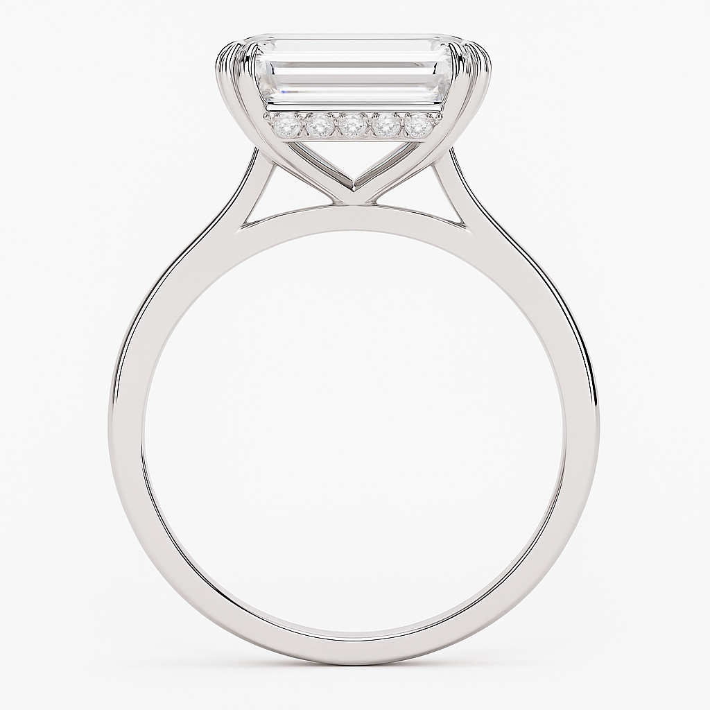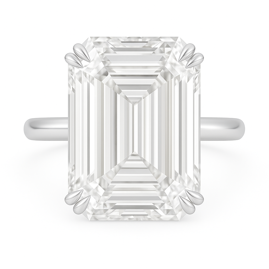 The Georgia ring exudes timeless sophistication, showcasing a breathtaking 6ct emerald-cut stone that commands attention with its clean, elongated lines. Securely set with elegant double prongs, the design offers both strength and refinement, allowing the centre stone to shine in all its brilliance.