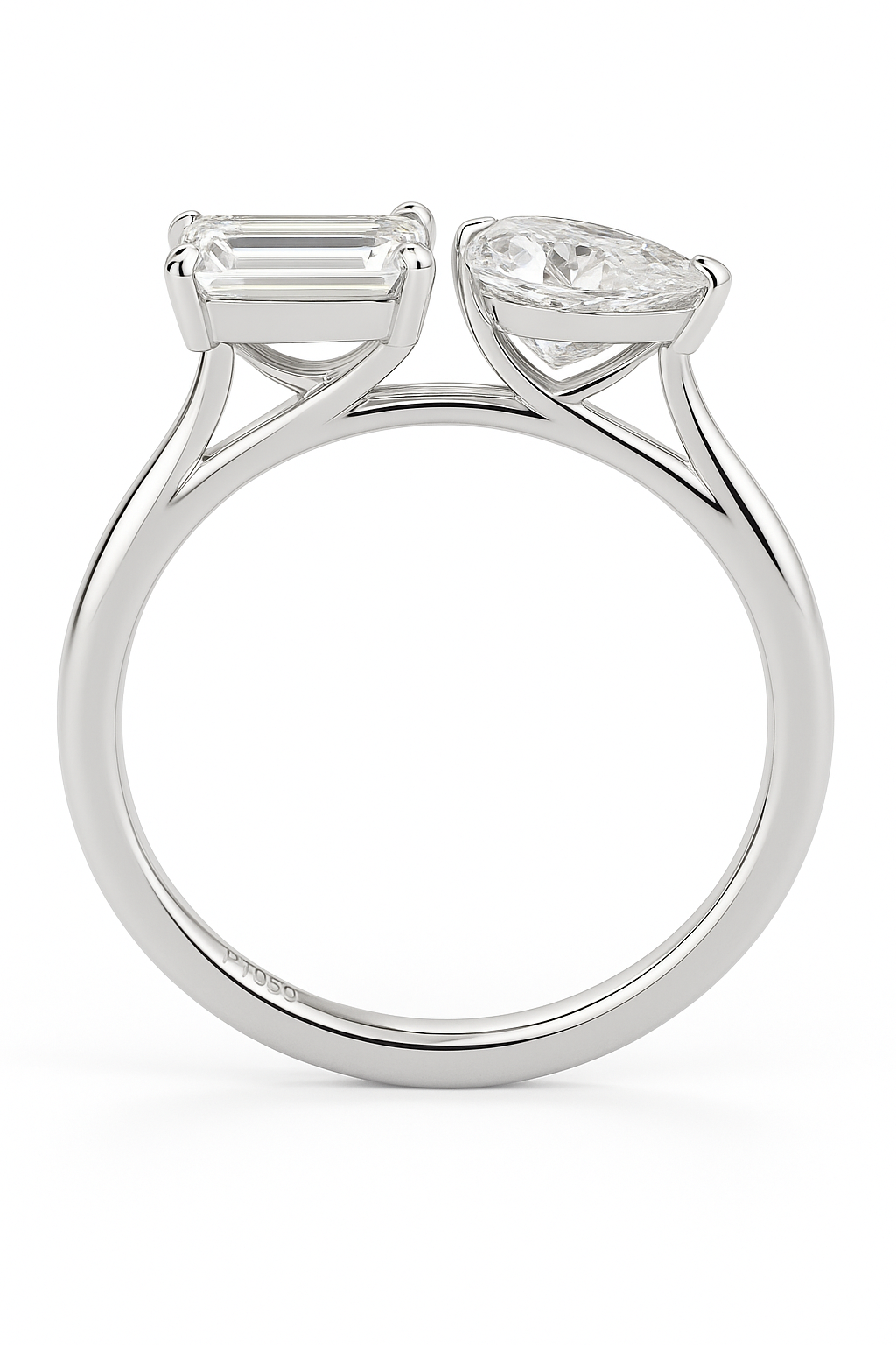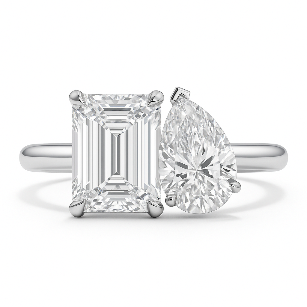 A contemporary take on the iconic Toi Et Moi silhouette. Featuring a 2ct emerald cut and a 2ct pear cut, the Harriet balances contrast and harmony with effortless poise. The sharp, architectural lines of the emerald cut meet the soft curves of the pear, creating a composition that feels both directional and timeless. A modern heirloom designed to stand out quietly — and speak volumes. ✨💍
