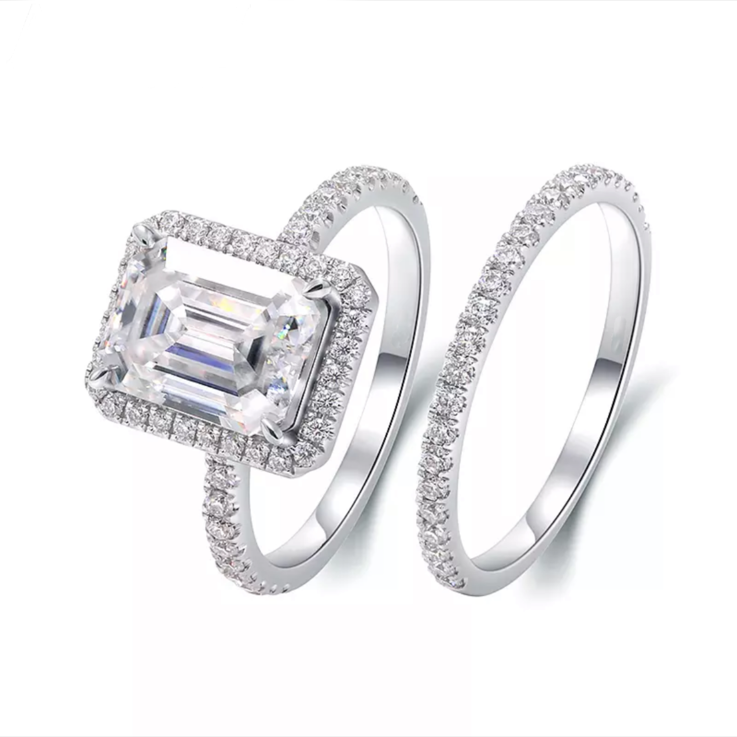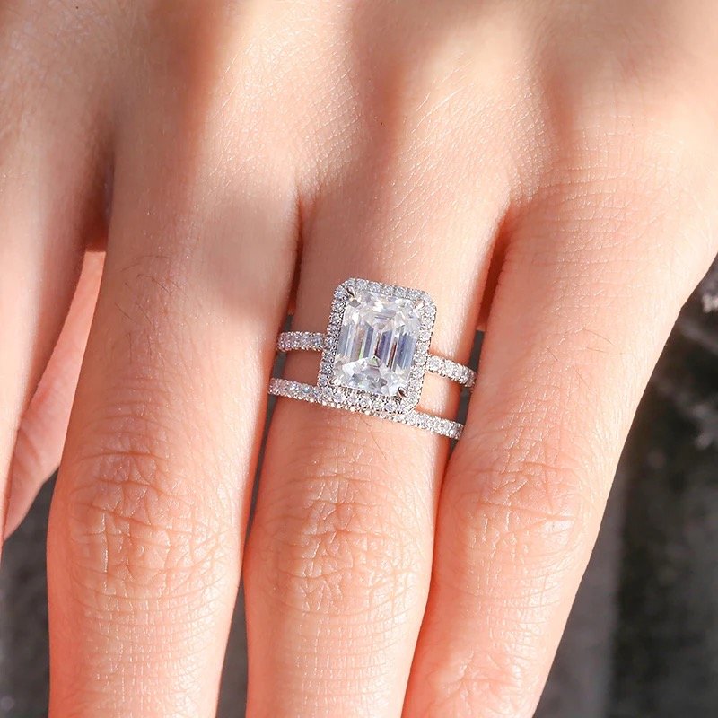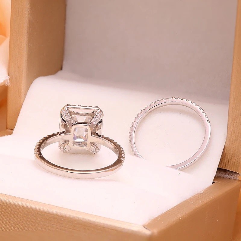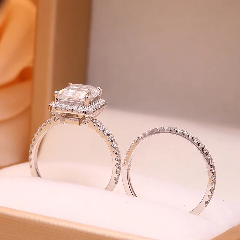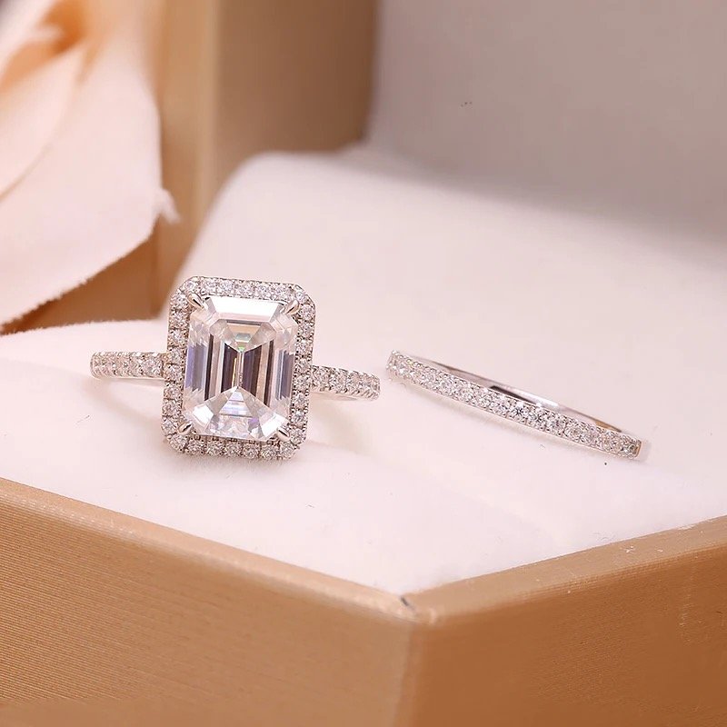 The Hawthorne Bridal set is a striking and impressive ensemble, featuring a dazzling 3ct (7*9mm) Engagement ring and an elegant matching band. The Engagement ring has a halo and the stone is set with four prongs.