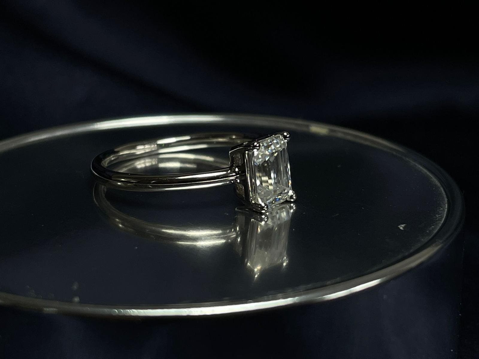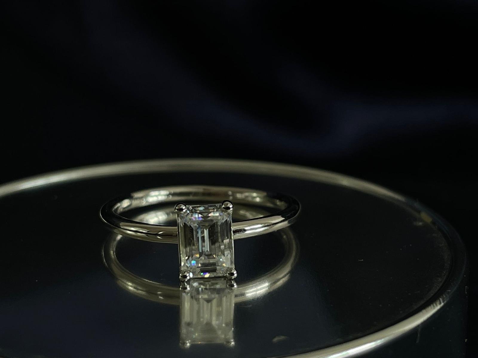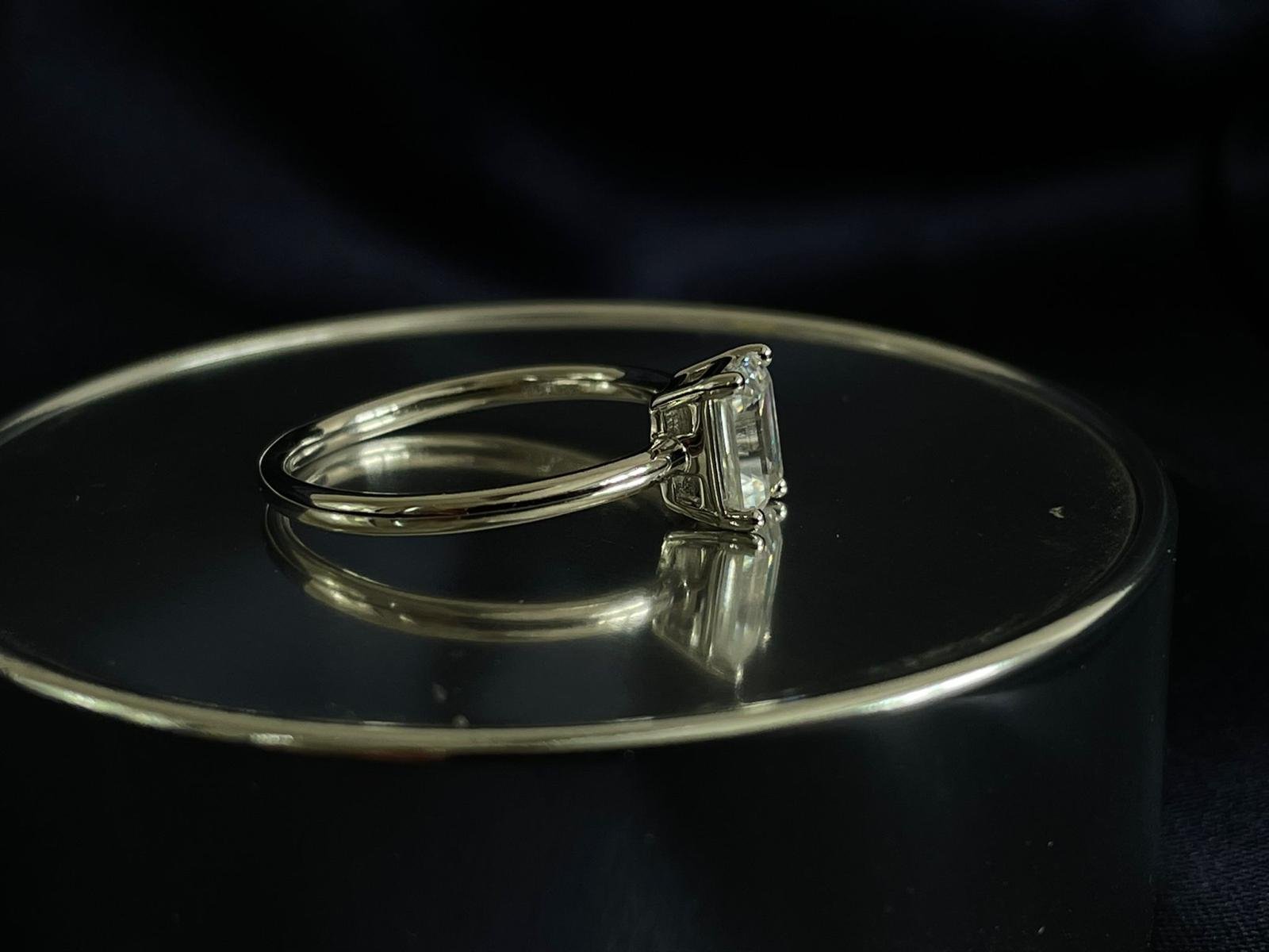The Hayley Ring is a study in modern elegance. At its center, a 1ct emerald-cut stone takes the spotlight — prized for its clean lines, captivating clarity, and quiet sophistication. Set in a sleek four-prong setting, every detail is thoughtfully designed to let the beauty of the stone shine.