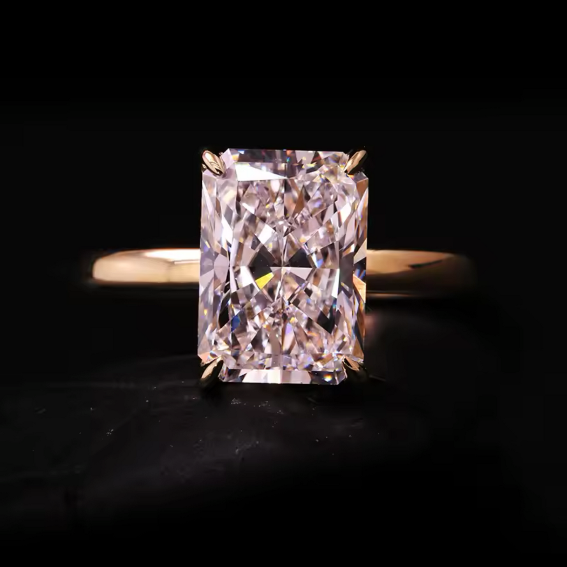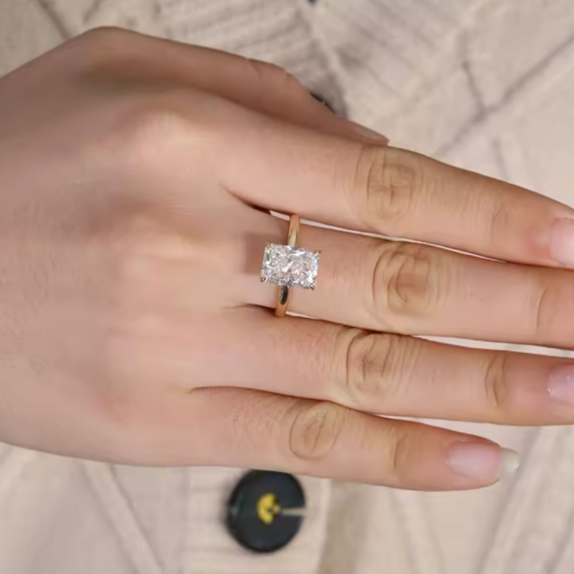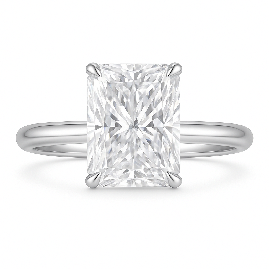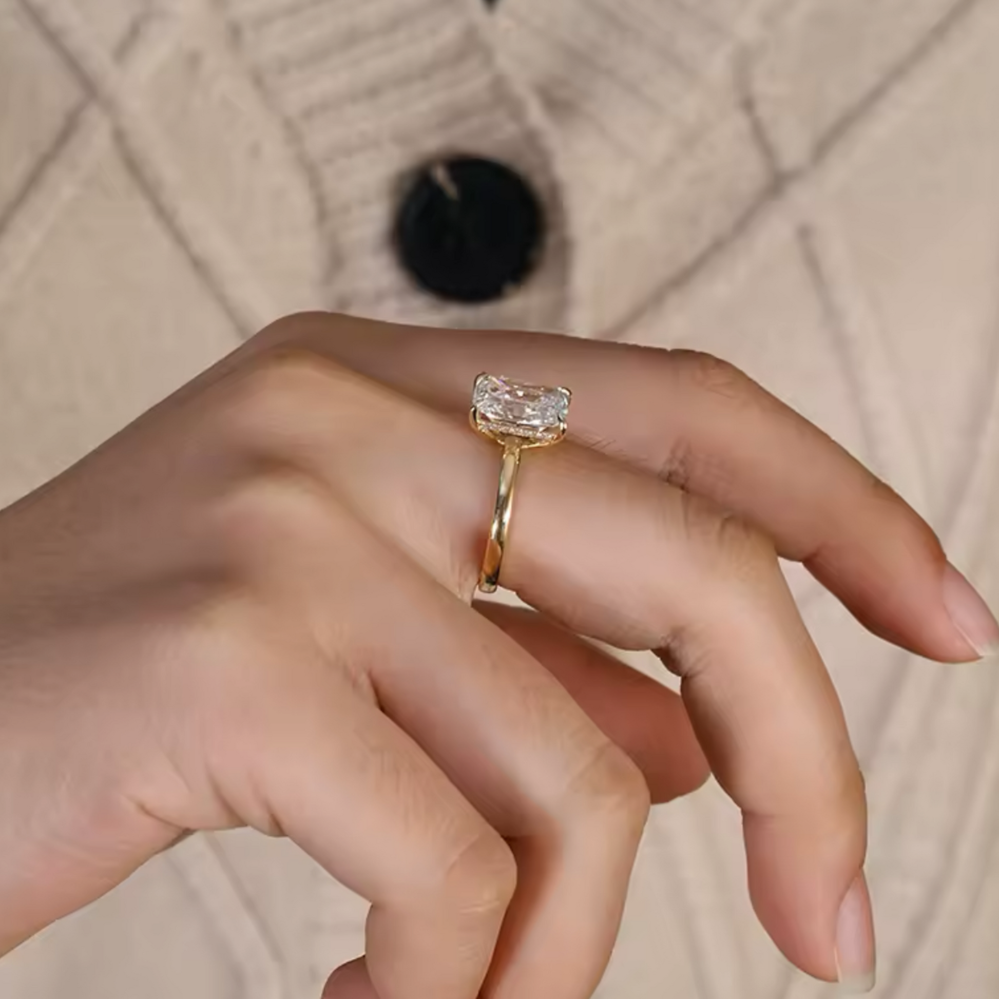 Our Jane Ring is a stunning blend of modern elegance and timeless sophistication. Featuring a 3ct radiant-cut center stone, available in both diamond and moissanite, this breathtaking design is set in a classic four-prong setting to maximize brilliance and light reflection.