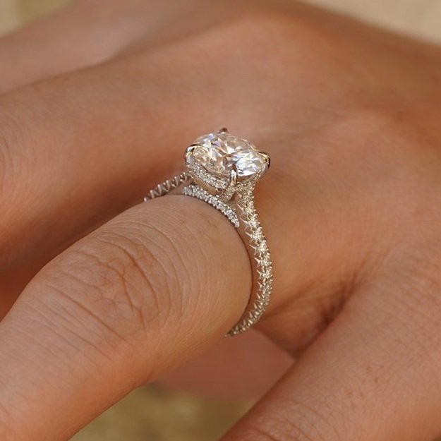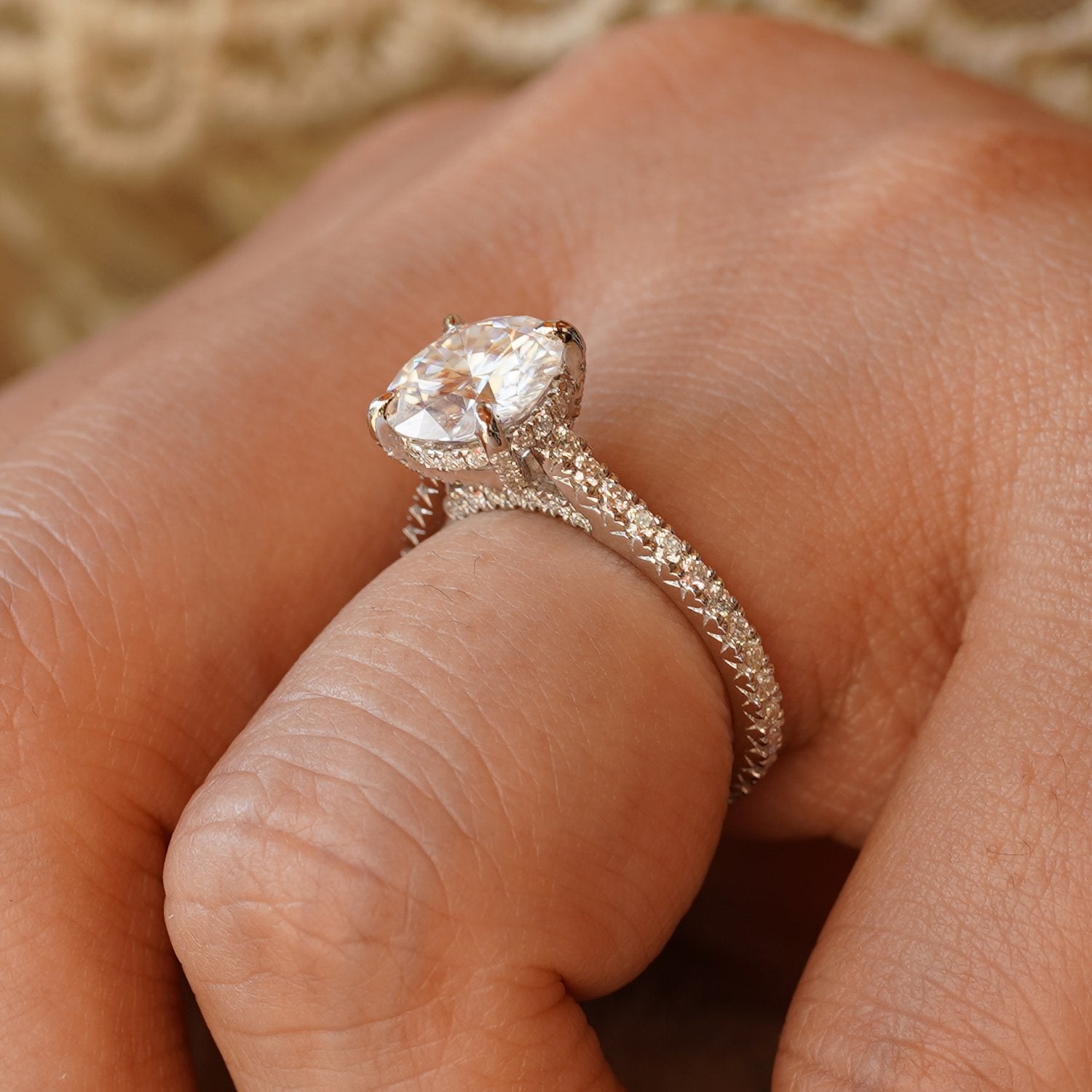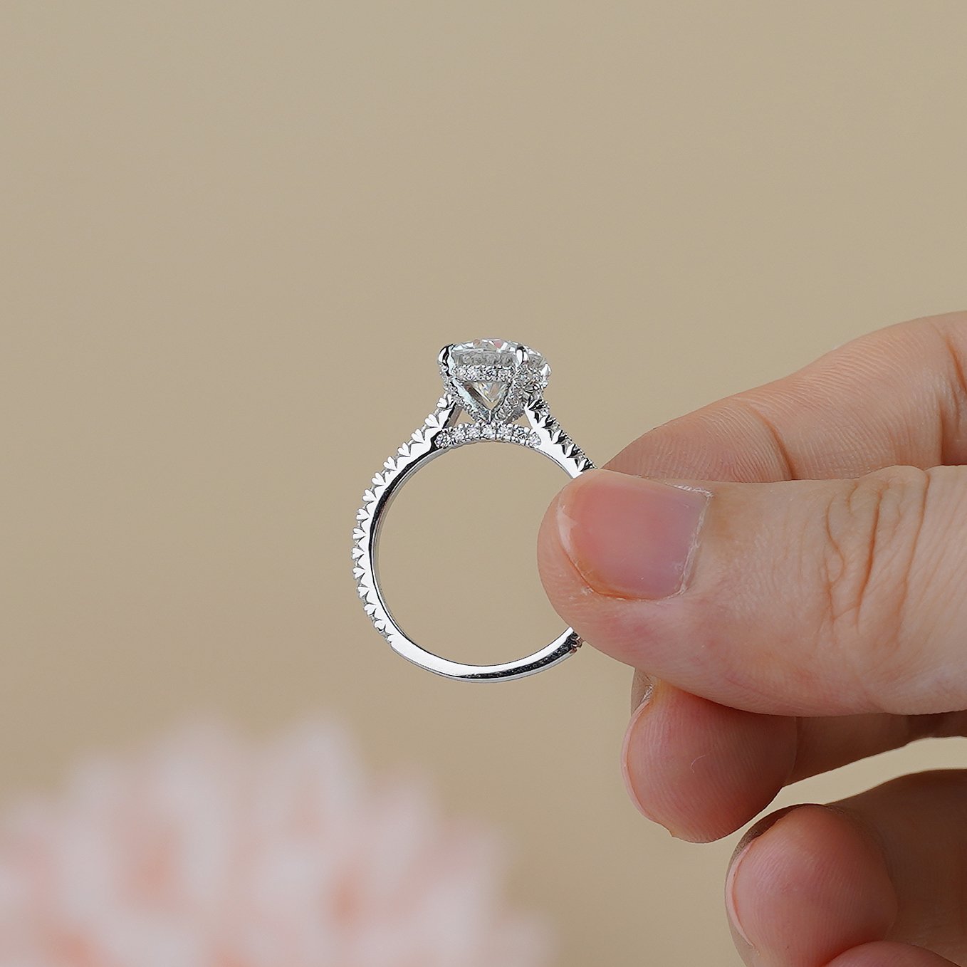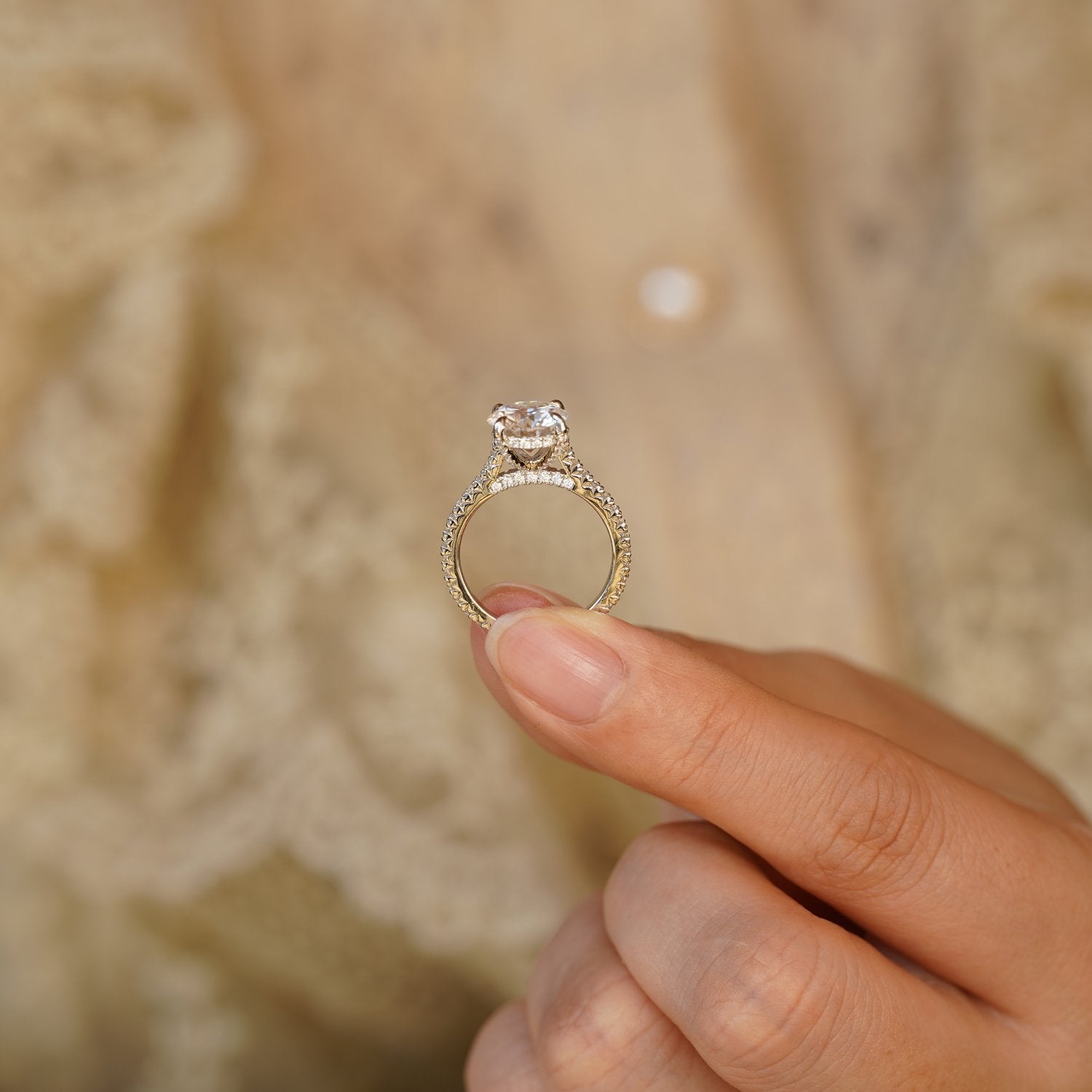 The intricate pavé detailing along the band adds a touch of timeless elegance, while a hidden halo beneath the center stone provides an extra layer of sparkle—visible only to the wearer for a truly special touch.