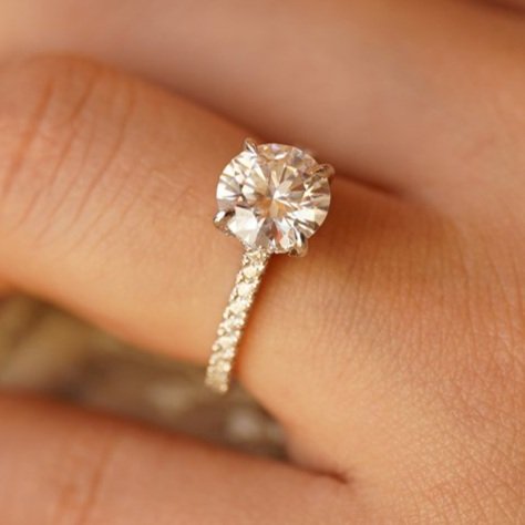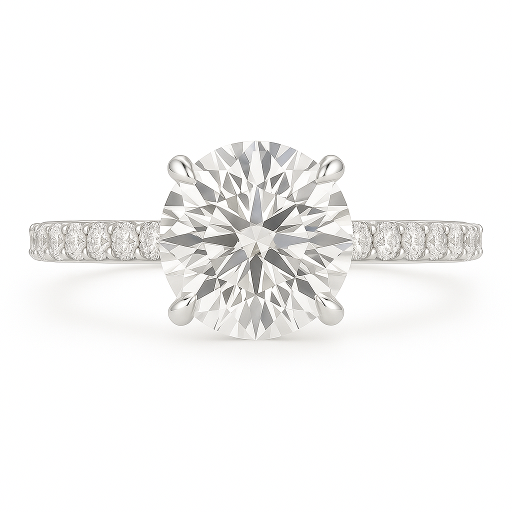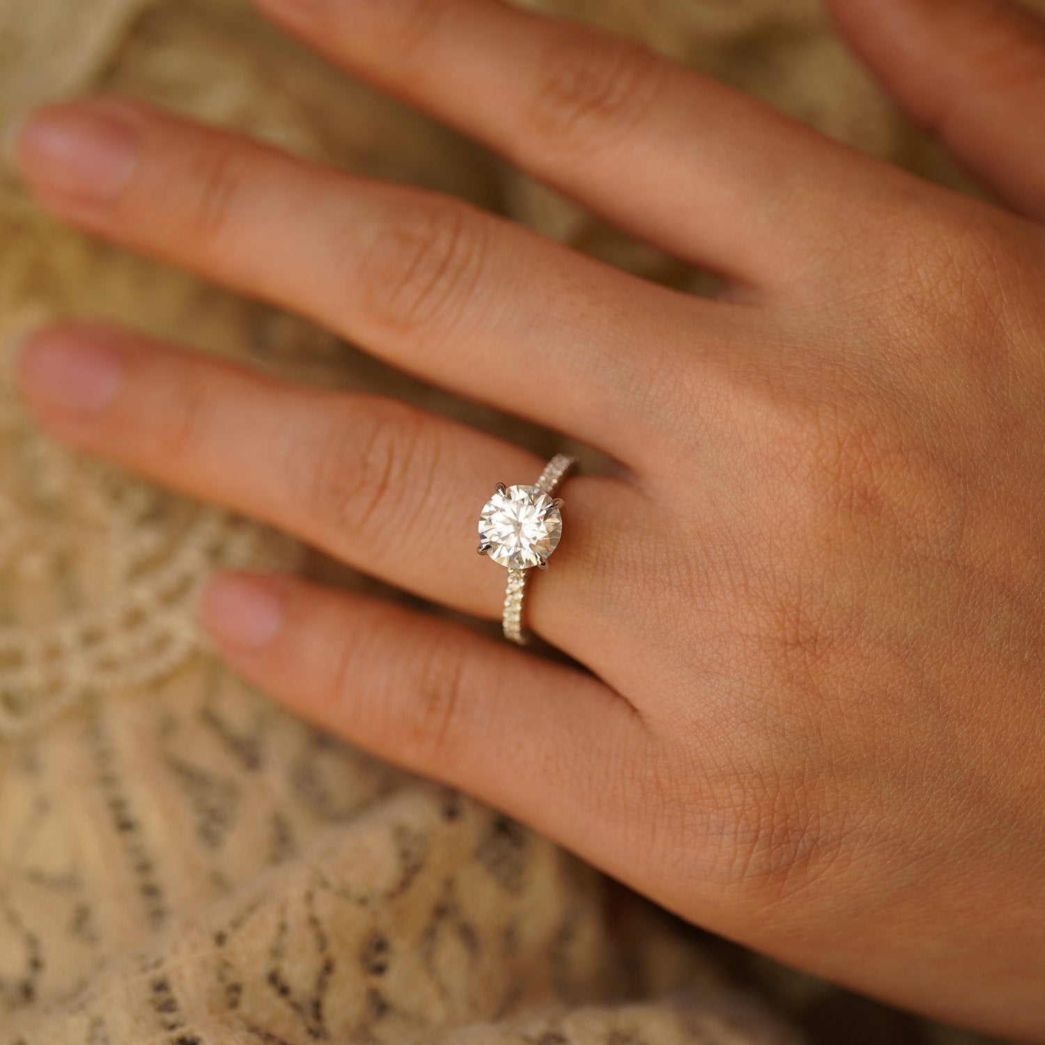 Introducing our Jess Ring—a modern and sophisticated take on the classic round-cut engagement ring. Available in both diamond and moissanite, this stunning design features a brilliant 2ct round-cut center stone, elegantly secured by four refined prongs to enhance its natural radiance.