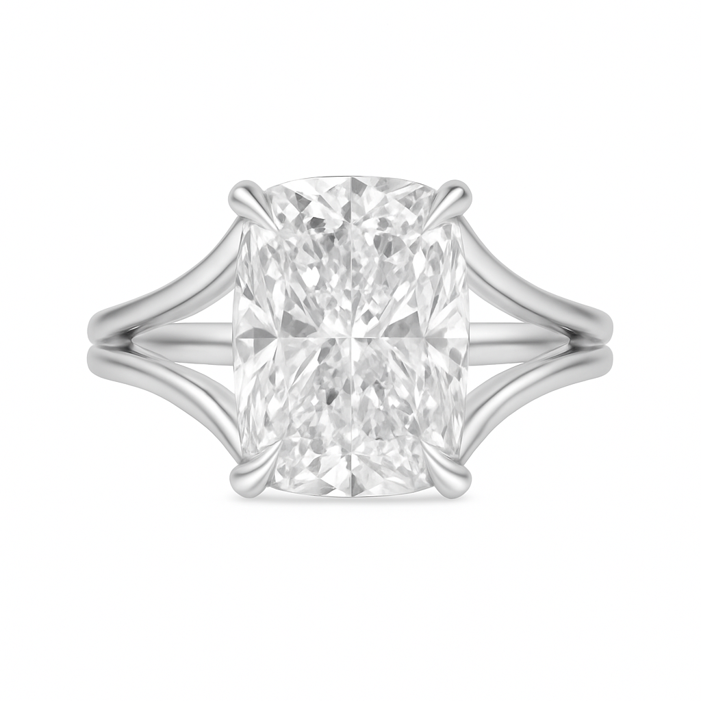 The Judith ring is a bold yet timeless design, featuring a radiant 3ct cushion-cut center stone that commands attention. Secured with four refined prongs, the stone is elevated by a distinctive split shank setting, creating a graceful frame that draws the eye toward its brilliance. The sculptural lines of the band offer both strength and delicacy, balancing modern elegance with classic allure. Sophisticated and striking, the Judith ring is a true statement of enduring beauty.