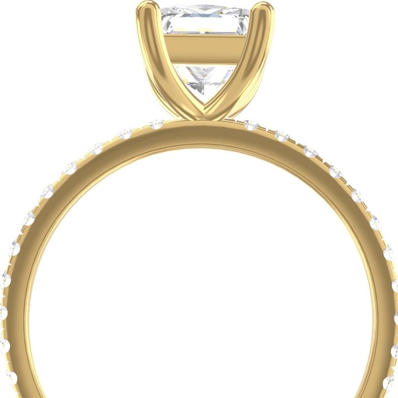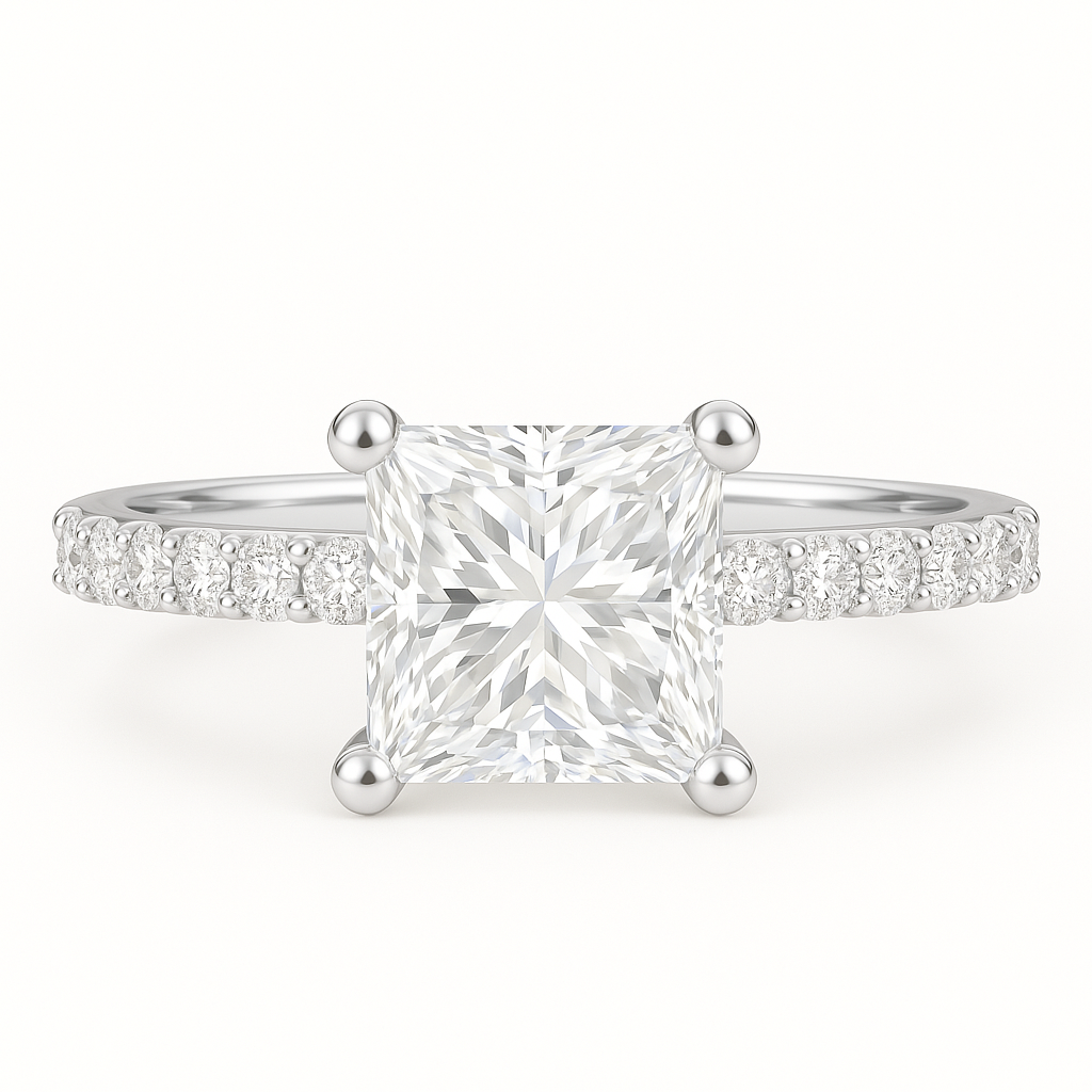Introducing the Kayla ring, a radiant testament to timeless allure and understated elegance. This enchanting piece showcases a luminous 1-carat princess-cut stone, poised delicately atop a pave band that glimmers with understated charm. Crafted with meticulous attention to detail, the Kayla ring effortlessly marries classic sophistication with modern sensibility, ensuring its enduring appeal for years to come. With its graceful design and captivating sparkle, it serves as a cherished symbol of beauty and grace, destined to adorn the finger of its wearer with timeless elegance and style.