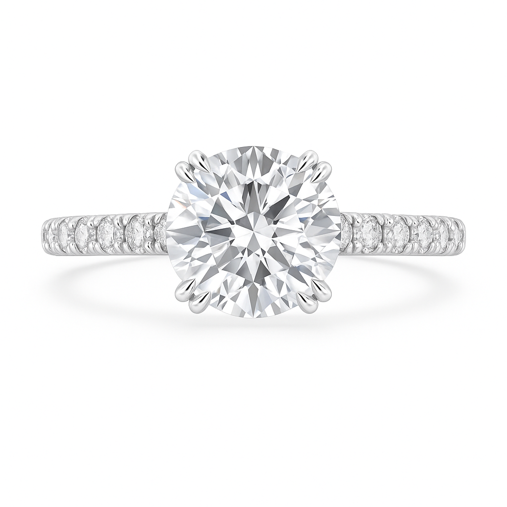 Our Liora ring exudes elegance with its stunning double-prong setting, securing a dazzling 1-carat center stone. The radiant moissanite is complemented by an exquisite pavé band, adding a touch of sophistication and sparkle to this timeless design.