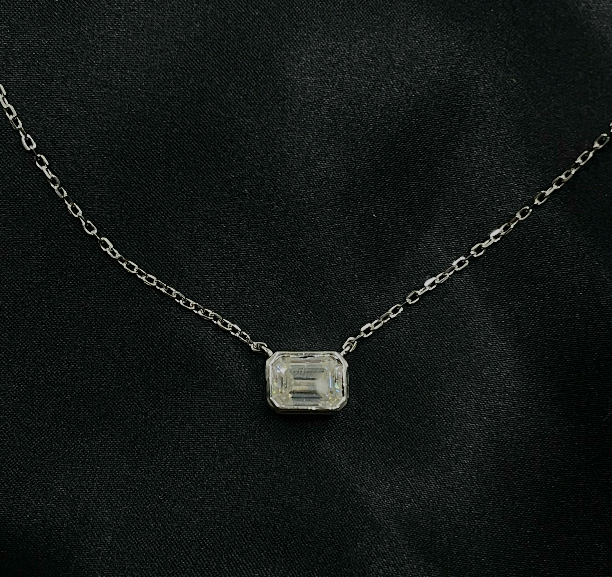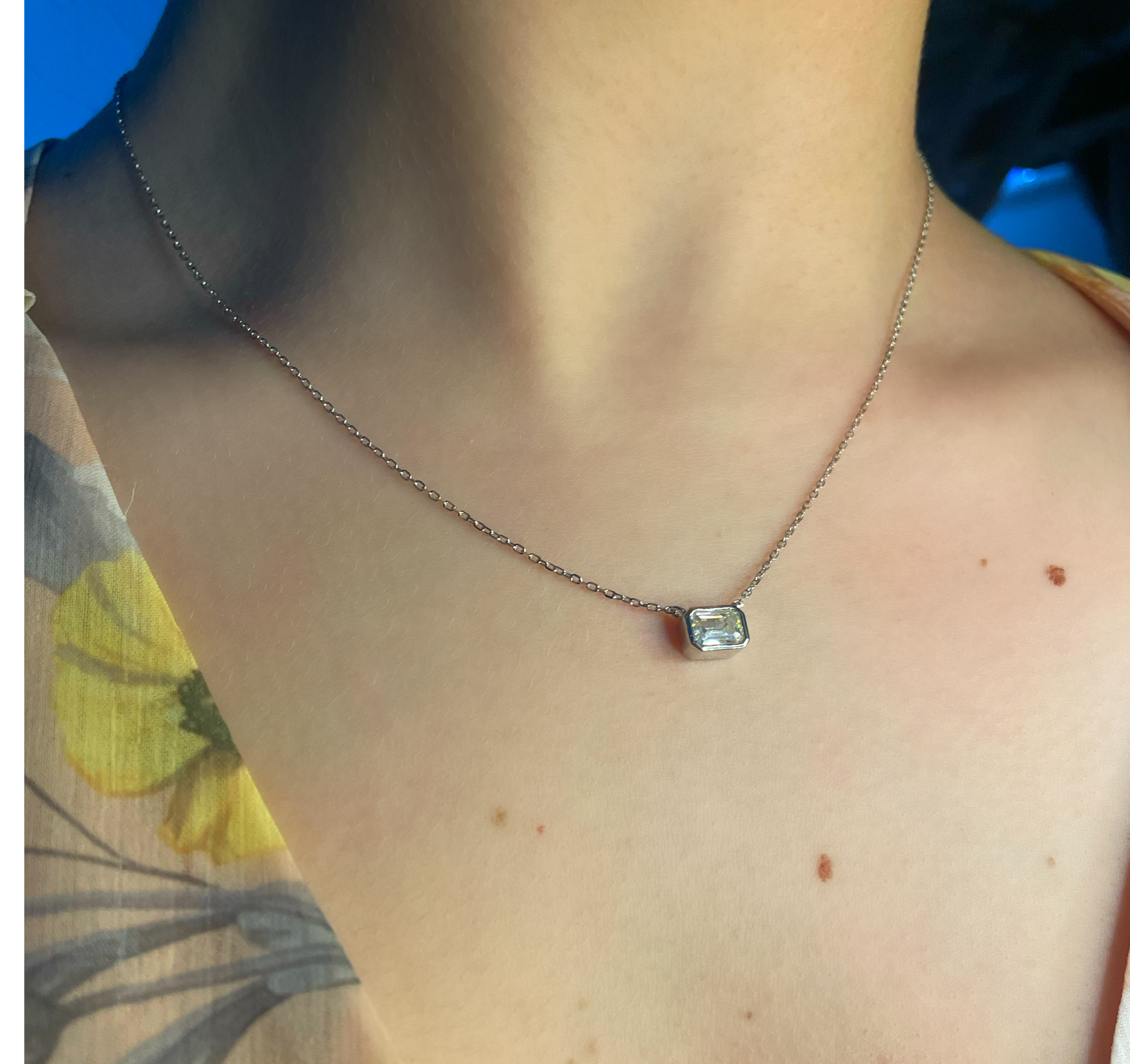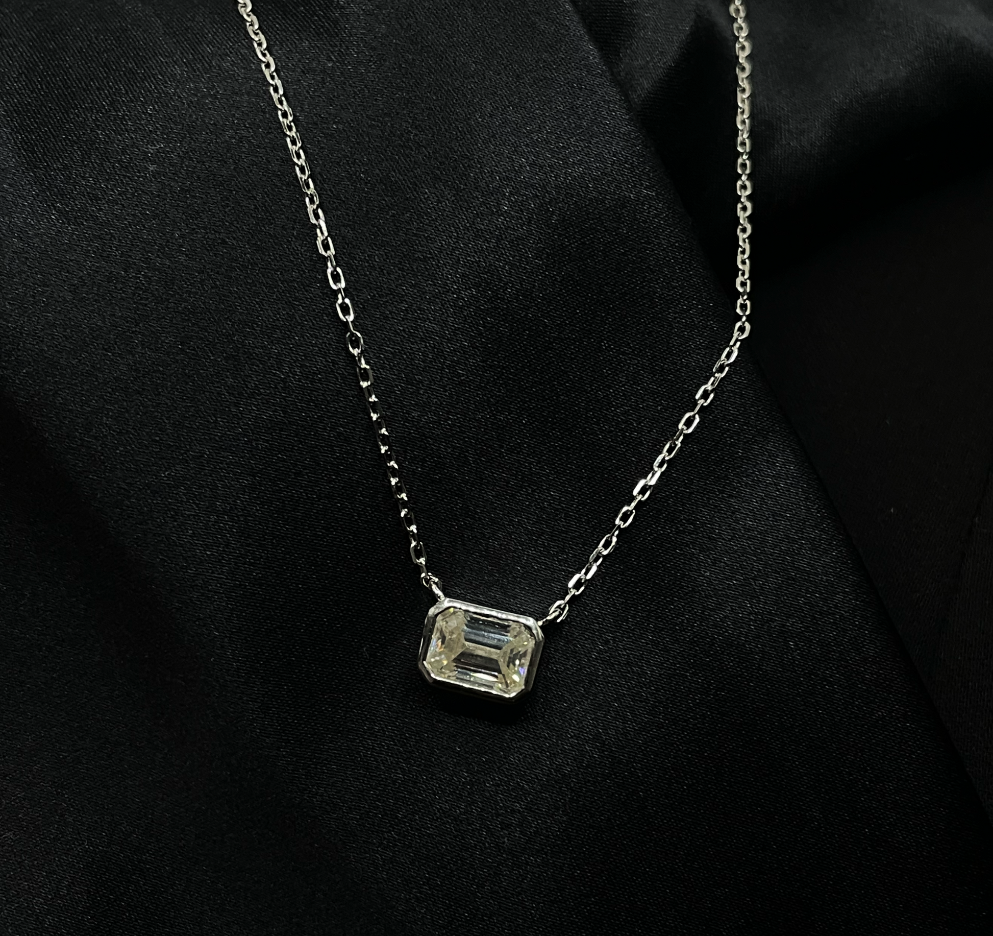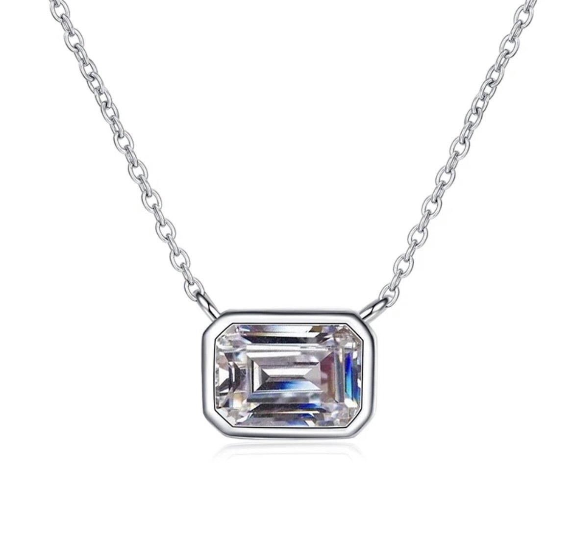 Our Maryse necklace features a stunning 1ct emerald cut stone, bezel set on a white gold plated sterling silver chain. This beautiful piece is comfortable for everyday wear and the perfect gift.