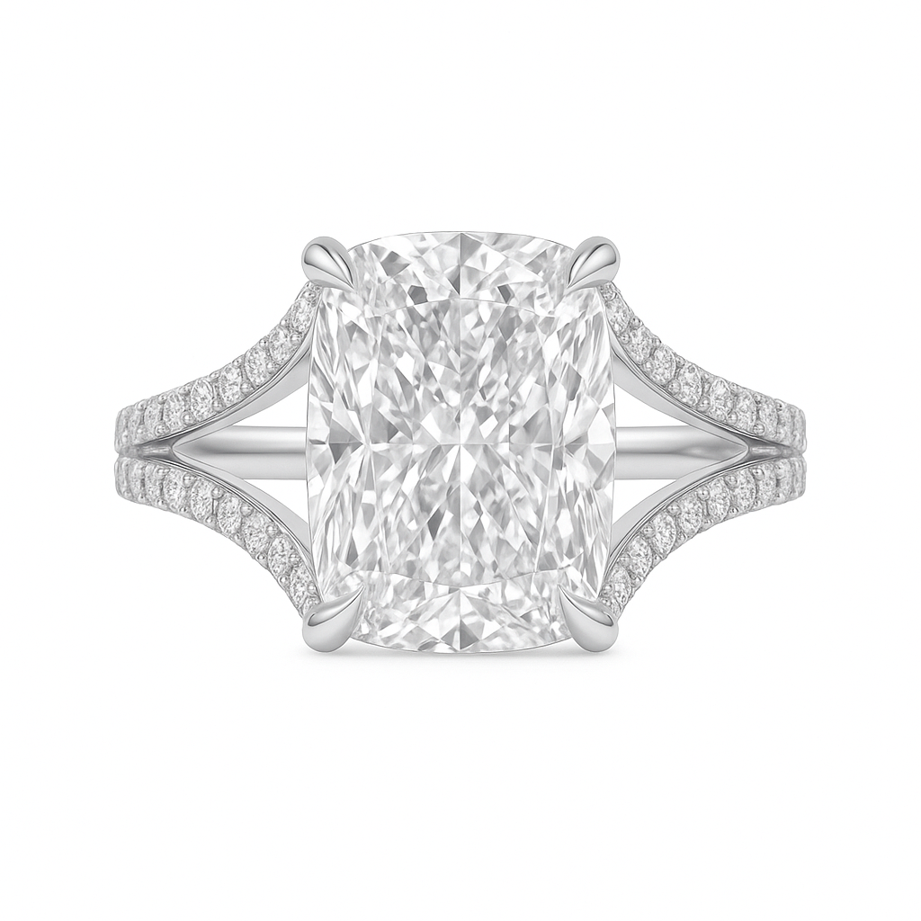 The Nora ring captivates with its striking balance of brilliance and design. At its heart rests a 3ct elongated cushion-cut stone, celebrated for its graceful silhouette and radiant fire. The center stone is elevated by a refined four-prong setting, while a dazzling split shank pavé band curves elegantly around the finger, catching the light from every angle. Bold yet feminine, the Nora ring is a modern masterpiece that marries timeless craftsmanship with an irresistible sparkle.