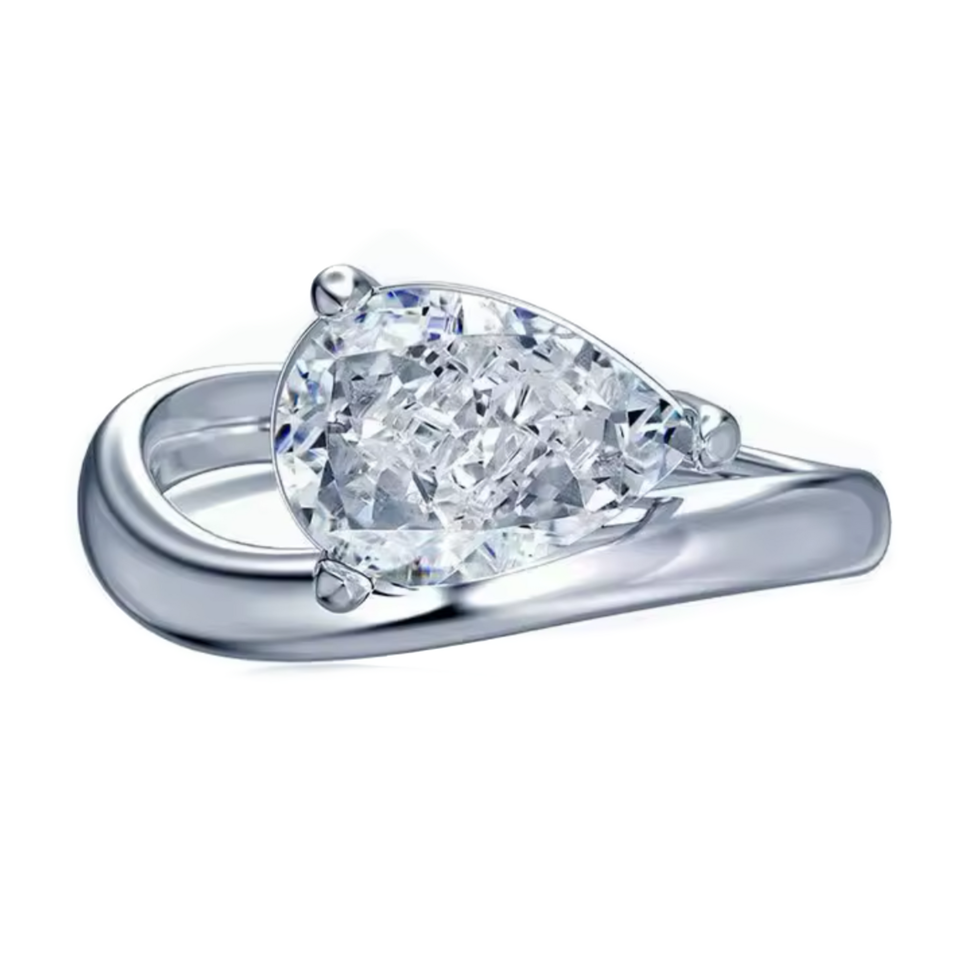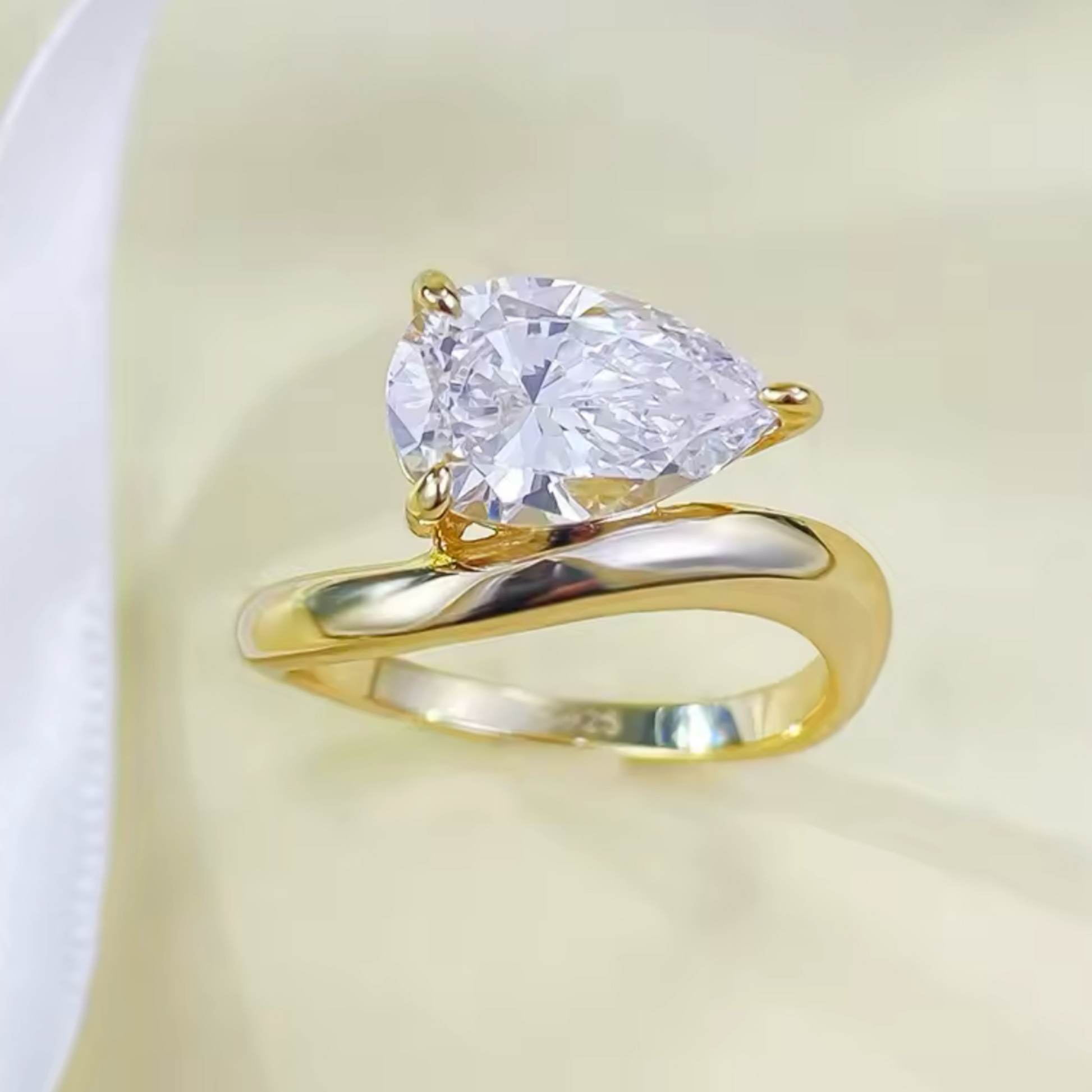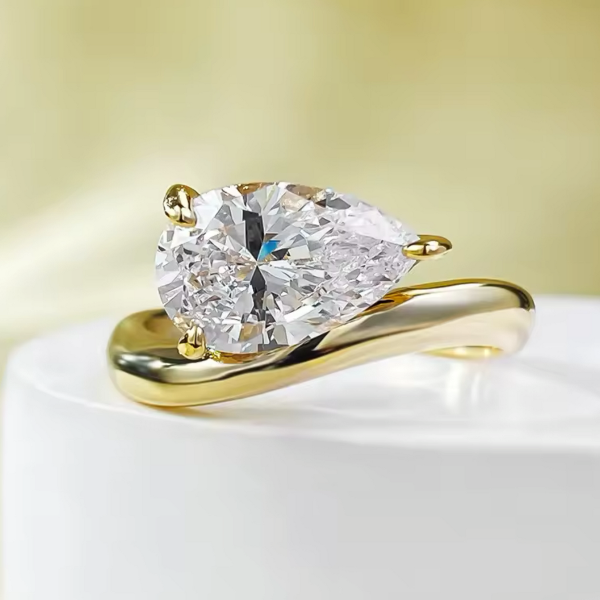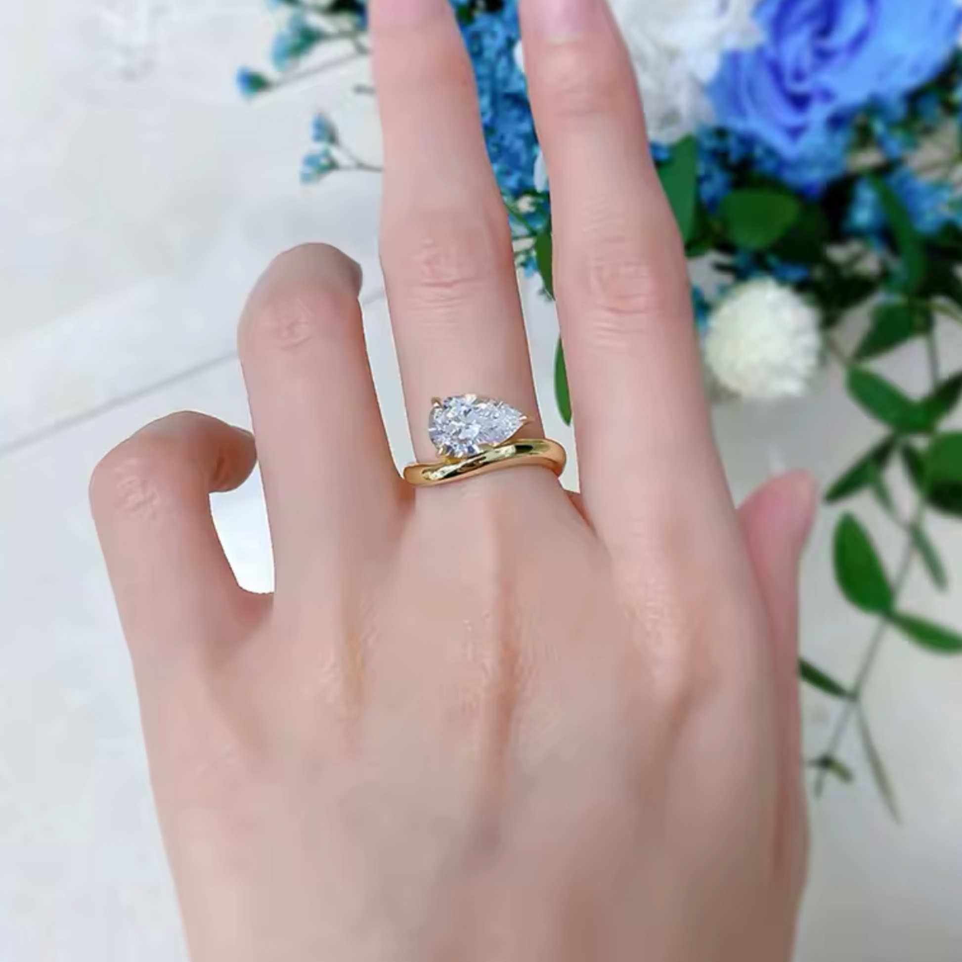 Our Paisley ring is the ultimate statement piece for the modern bride, featuring a stunning 3ct pear-cut moissanite set in a bold east-west orientation. This contemporary design redefines elegance with its sleek, unconventional style, making it the perfect choice for the effortlessly chic "cool girl" engagement ring. The brilliance of the pear-cut stone catches the light beautifully, creating a dazzling display that's both unique and unforgettable. With the Paisley ring, you're not just making a promise—you're making a statement.