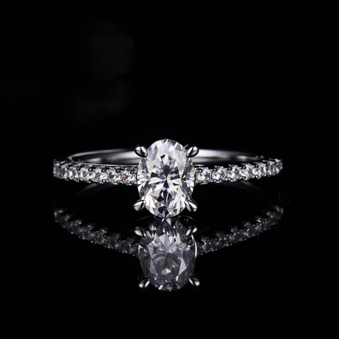 A bold take on classic elegance, the Rana ring features a 1ct oval-cut centre stone held in an intricate prong setting designed to elevate and illuminate. Delicate side accents add dimension and shimmer, framing the silhouette with a touch of glamour.
