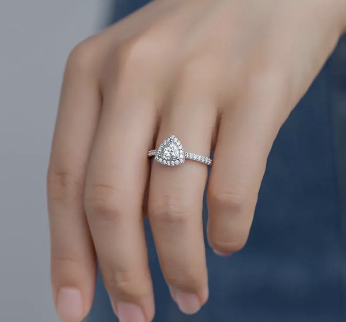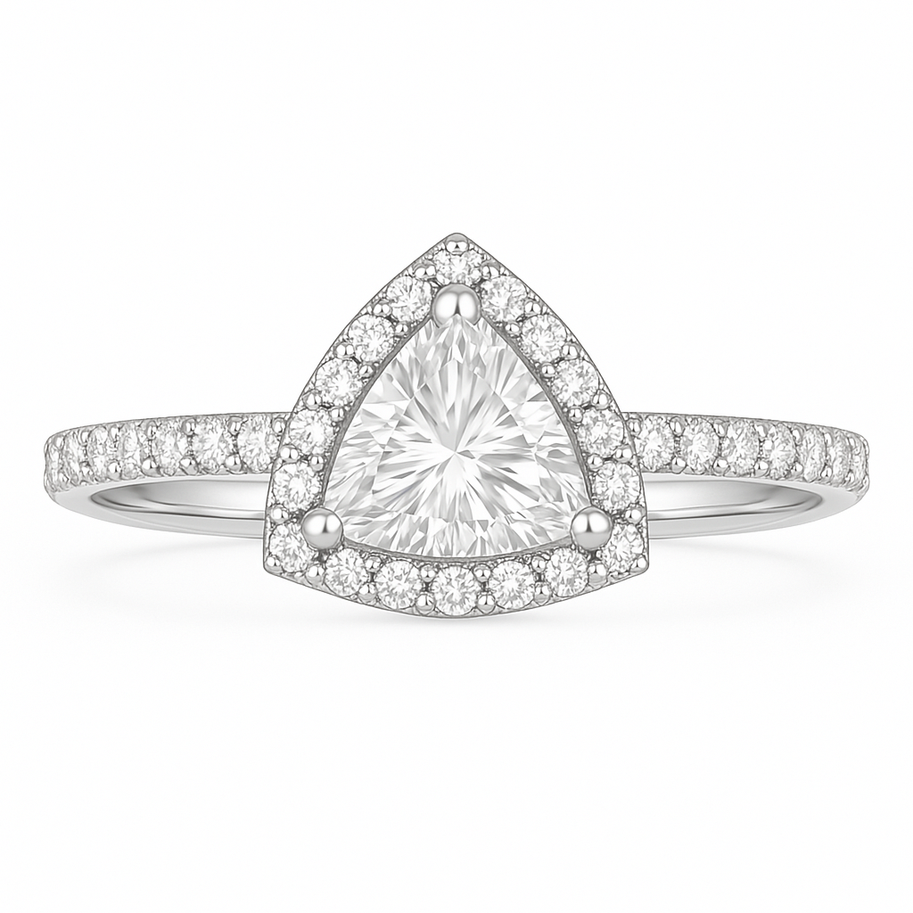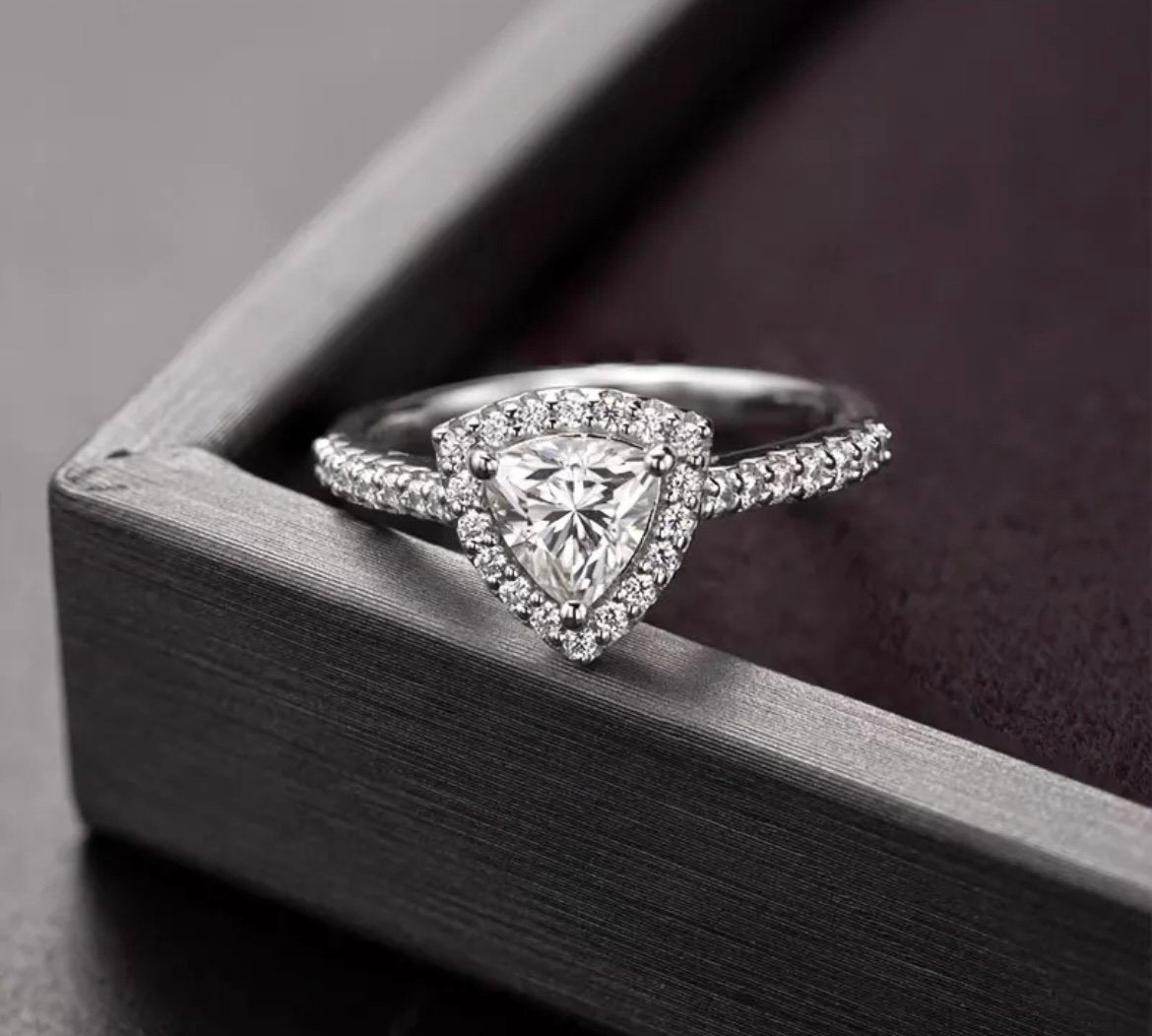 Our Rokecia Ring is a captivating 1ct trillion-cut engagement ring, designed to make a bold yet refined statement.