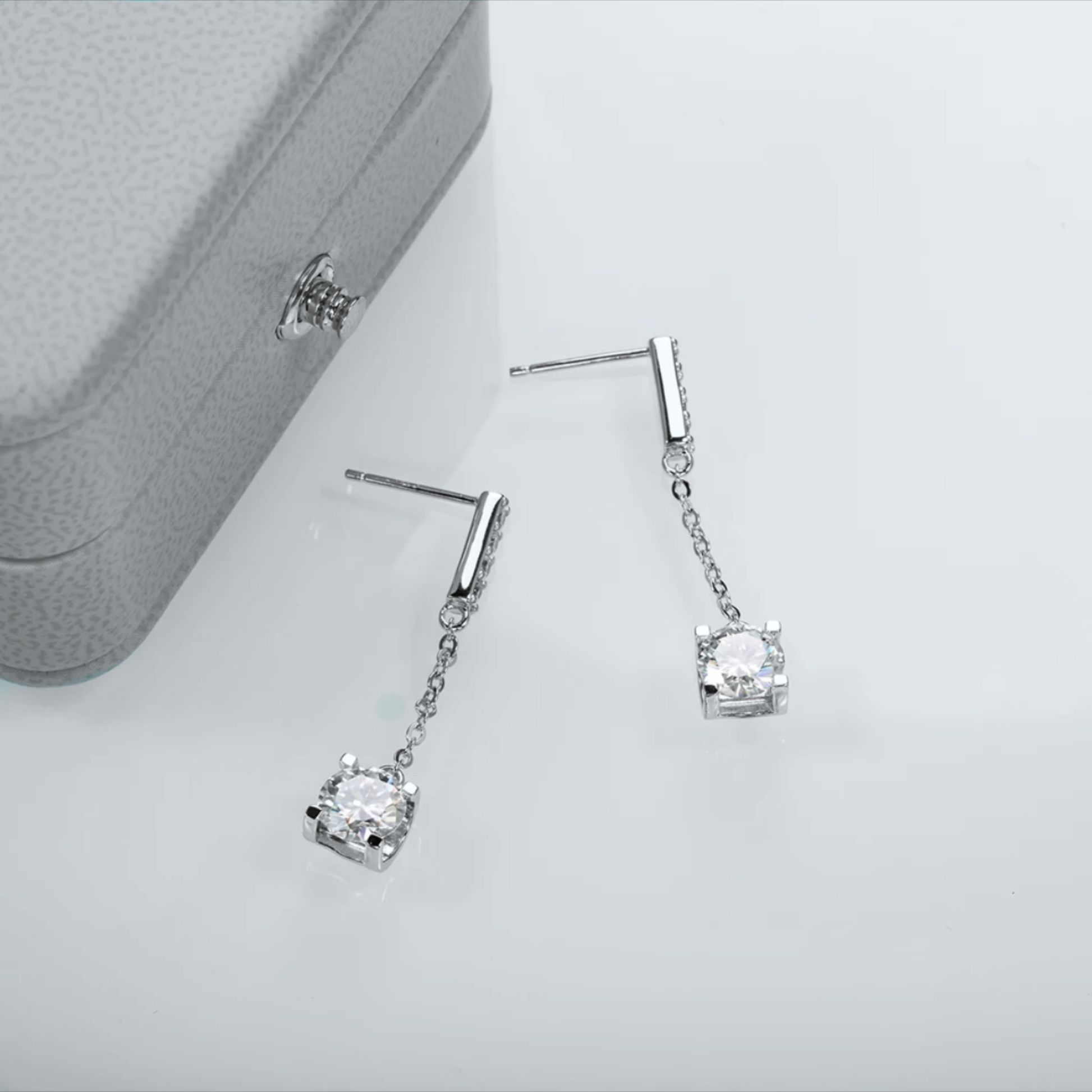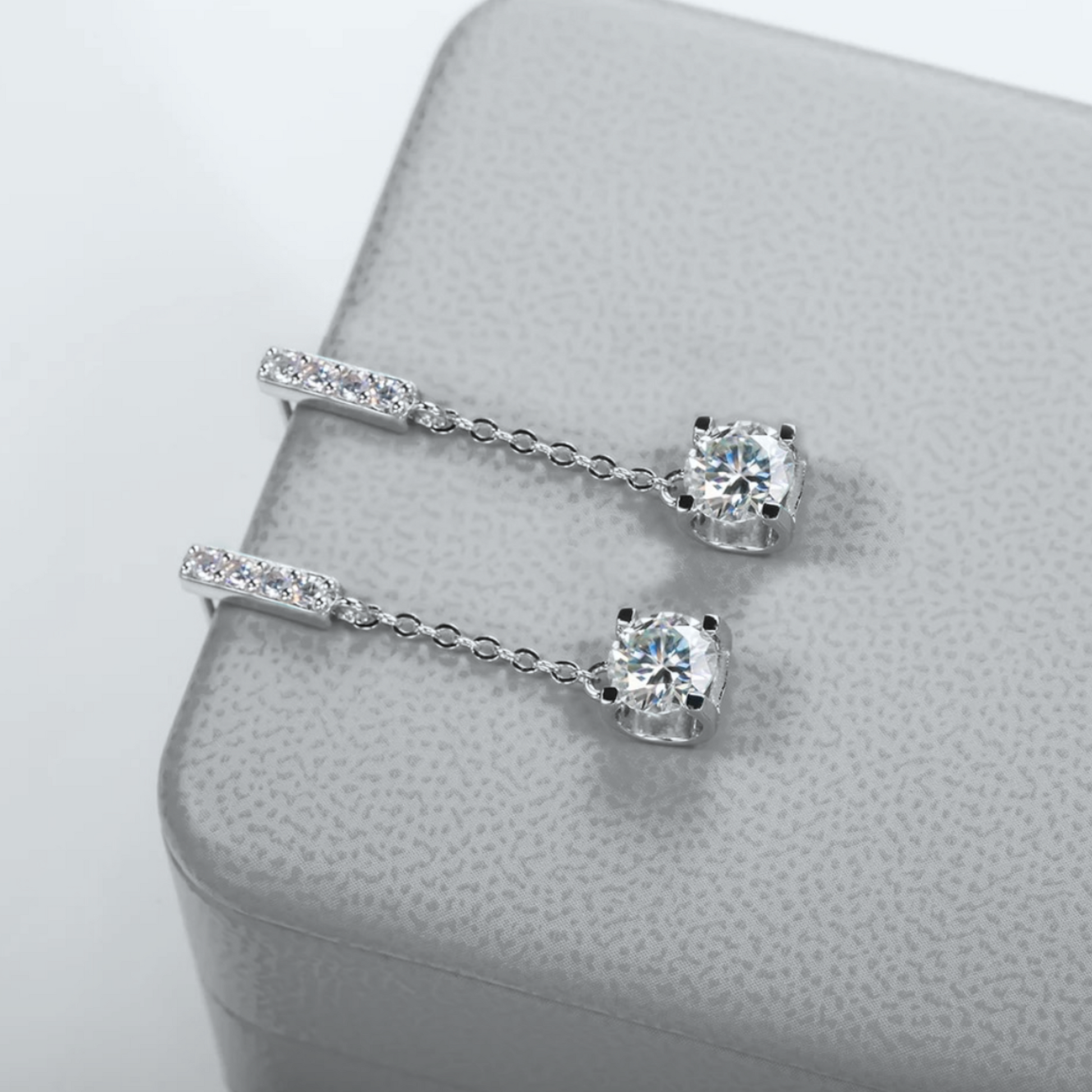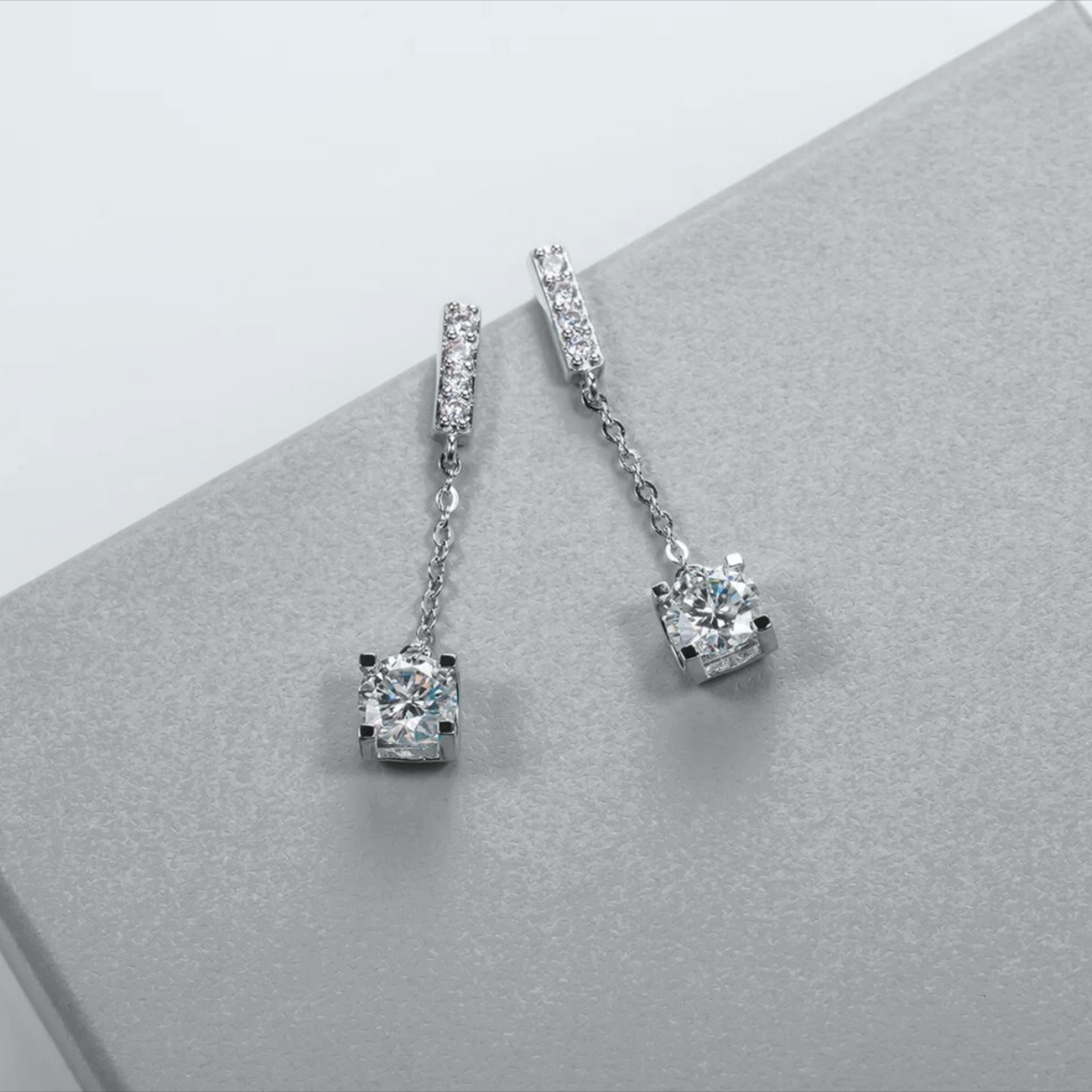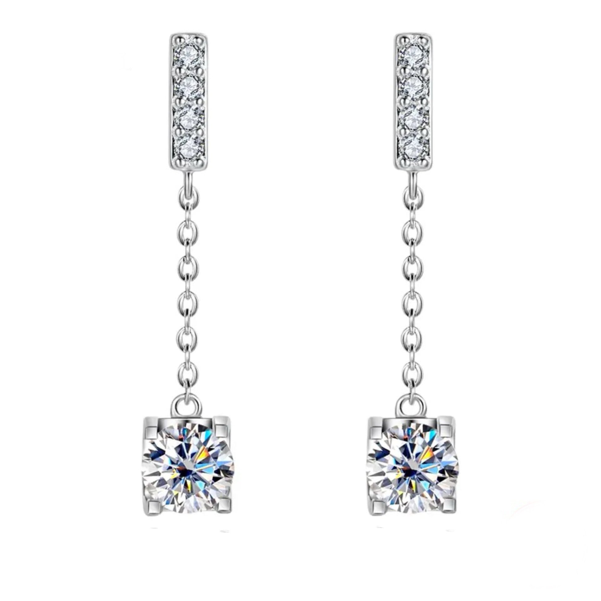 Our Sai earrings are a beautiful set of earrings, set in 18k Gold Plated sterling silver with a drop design, suspending 2ctw of D colour moissanites, 1ct Each side. The most elegant earrings which are striking but also subtle.