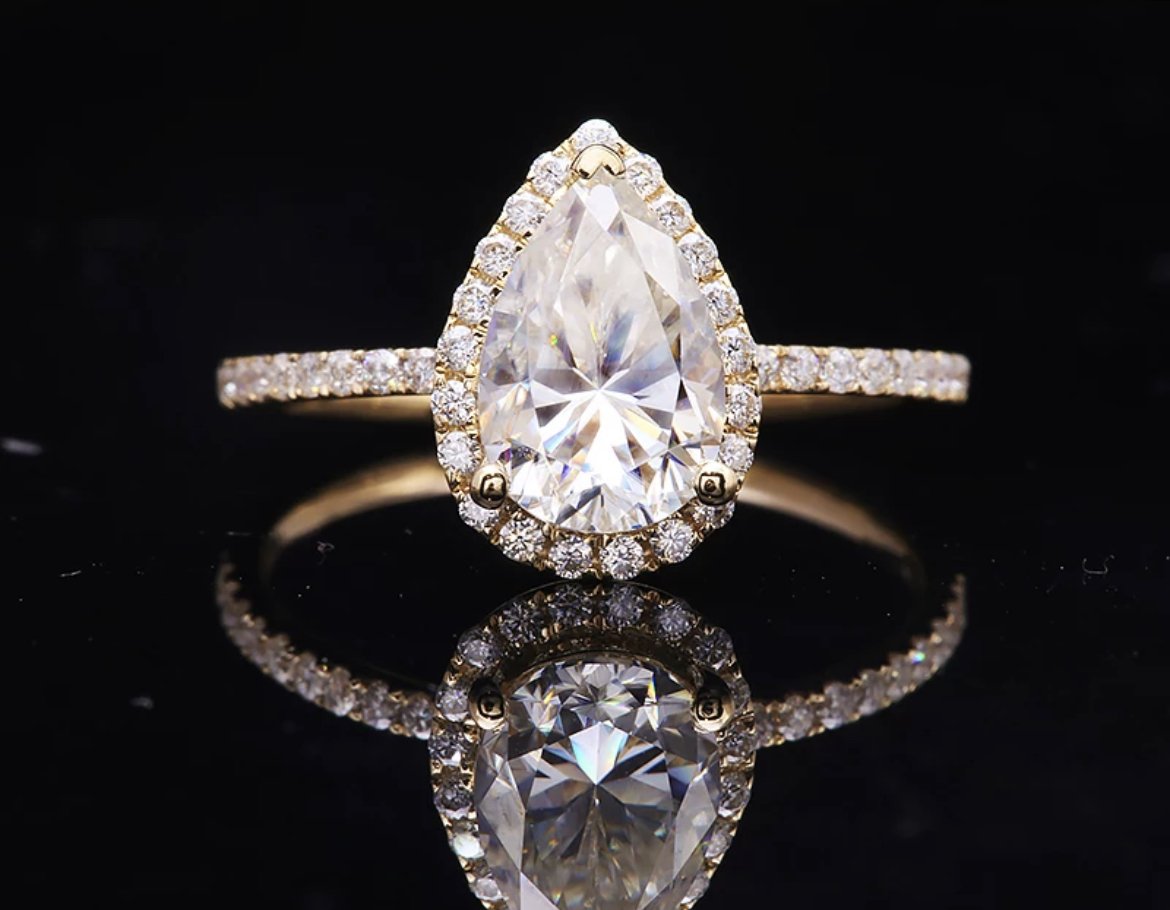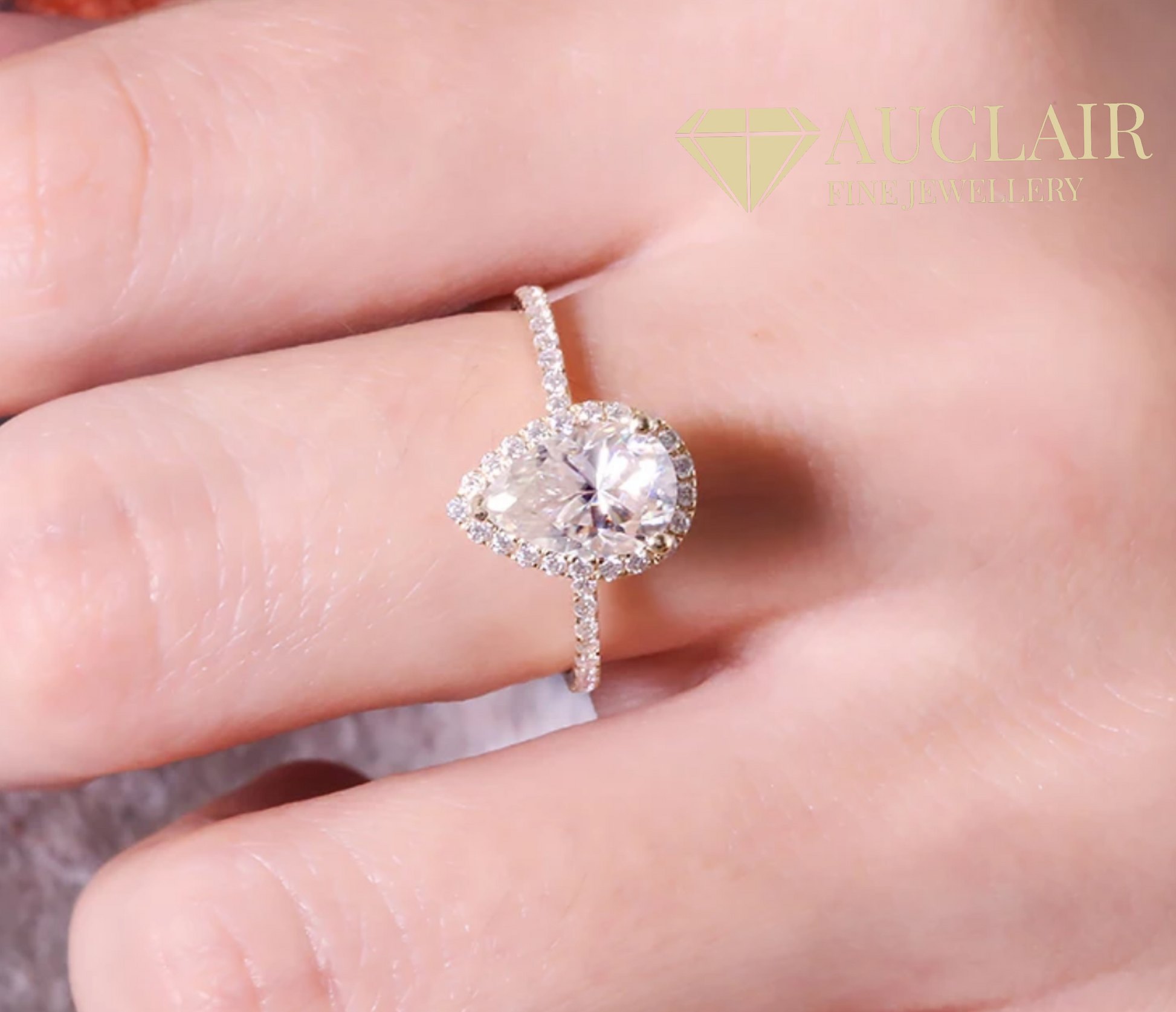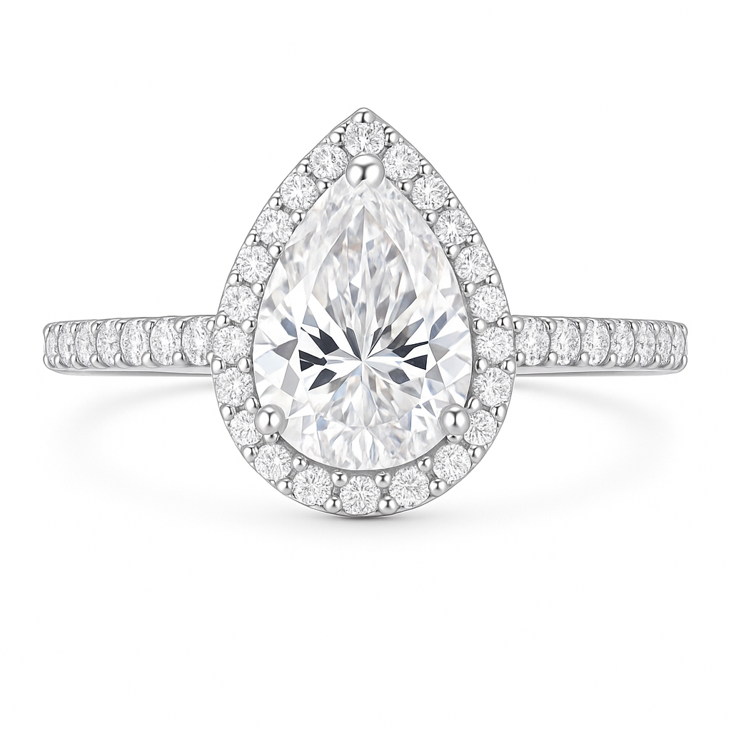 Introducing the Vanessa Ring – a timeless expression of elegance, featuring a striking 1.5ct pear-cut centre stone framed by a shimmering halo that enhances its natural brilliance. The softly tapered shape draws the eye with its graceful silhouette, balancing bold sparkle with refined charm.