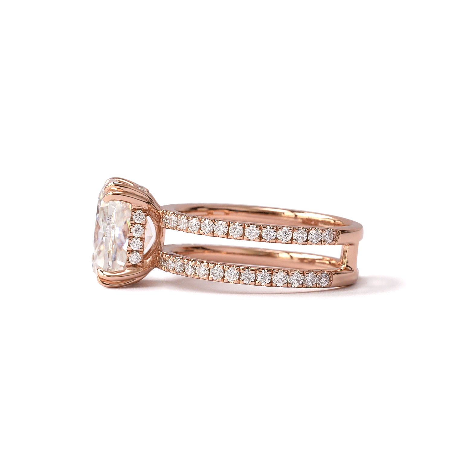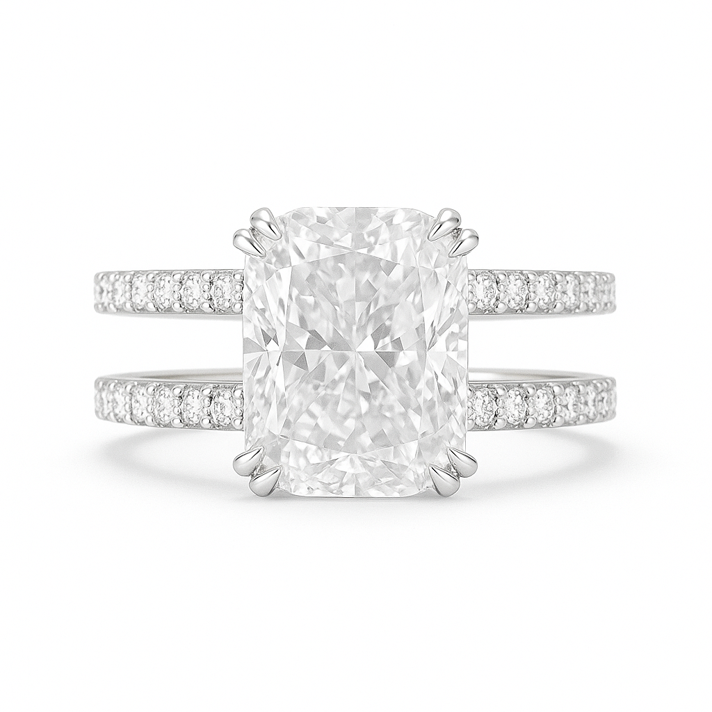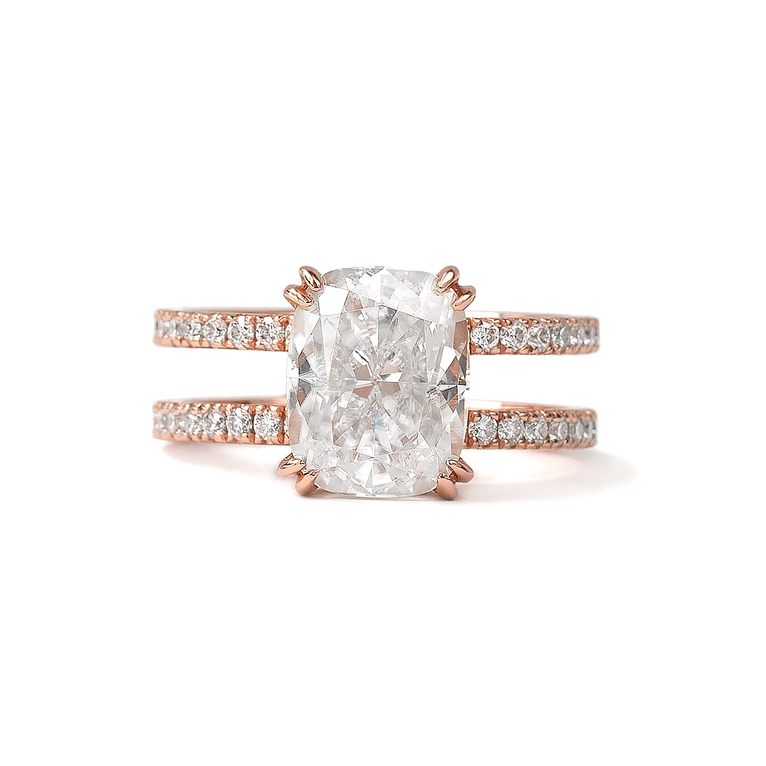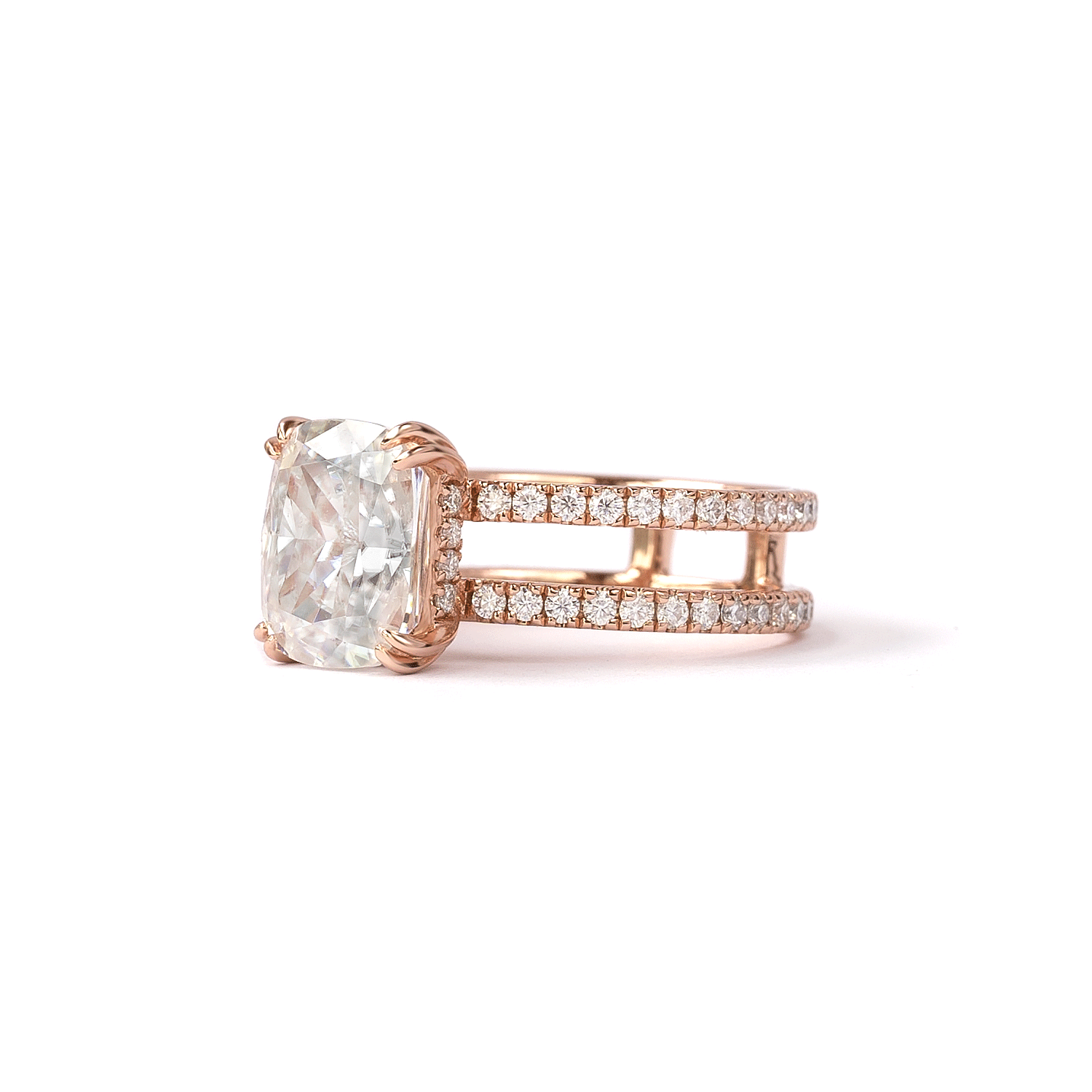 The Zahira ring features an incredible 3.5ct Crushed ice elongated cushion cut, which simply put, is one of the most stunning cuts available in moissanite. With beautiful clarity, this is a piece that will turn heads.