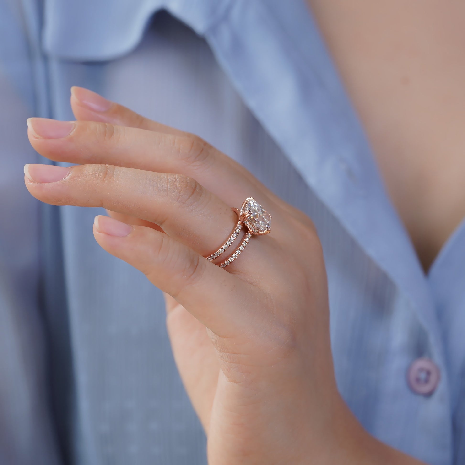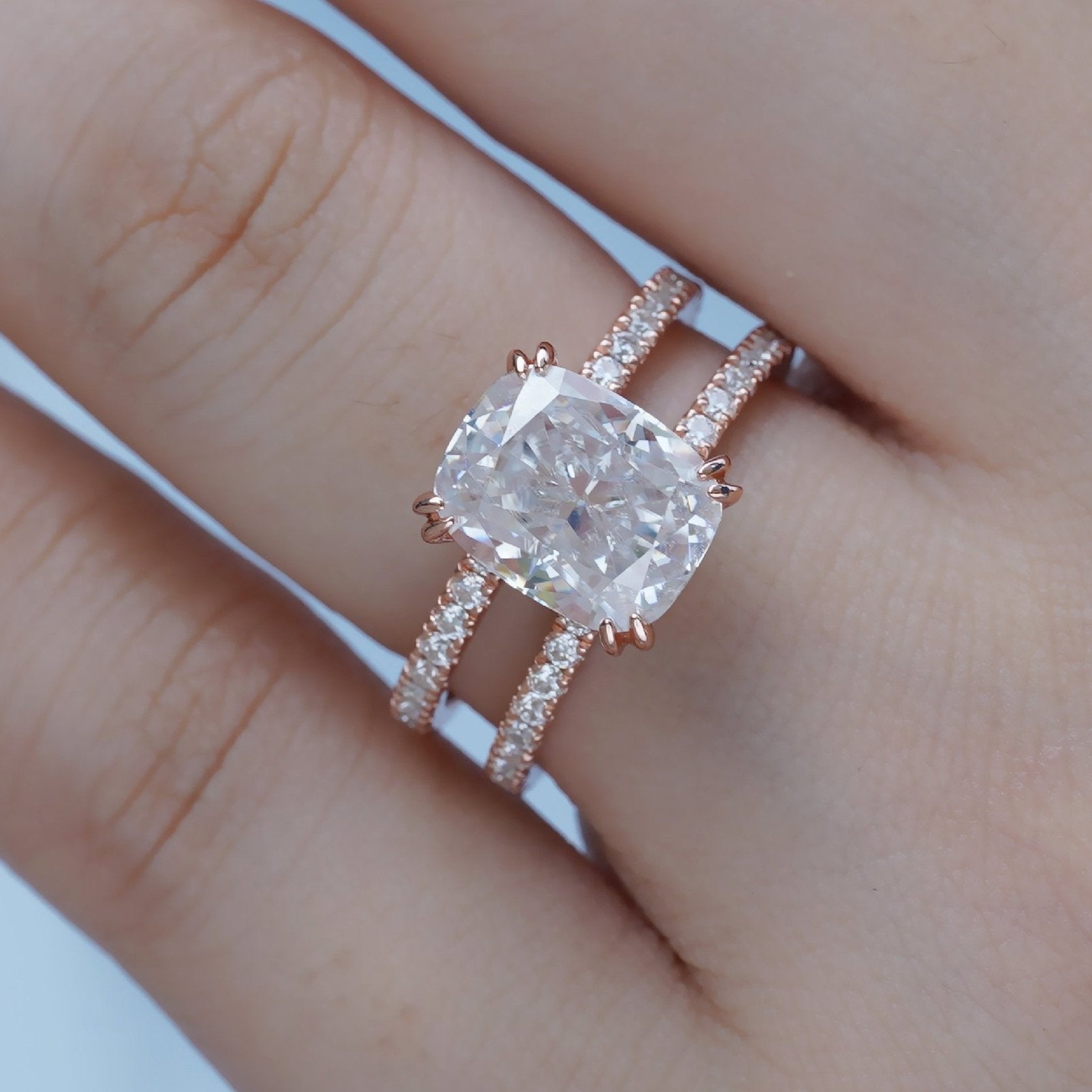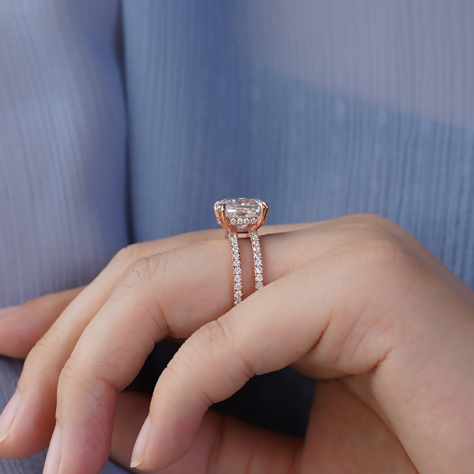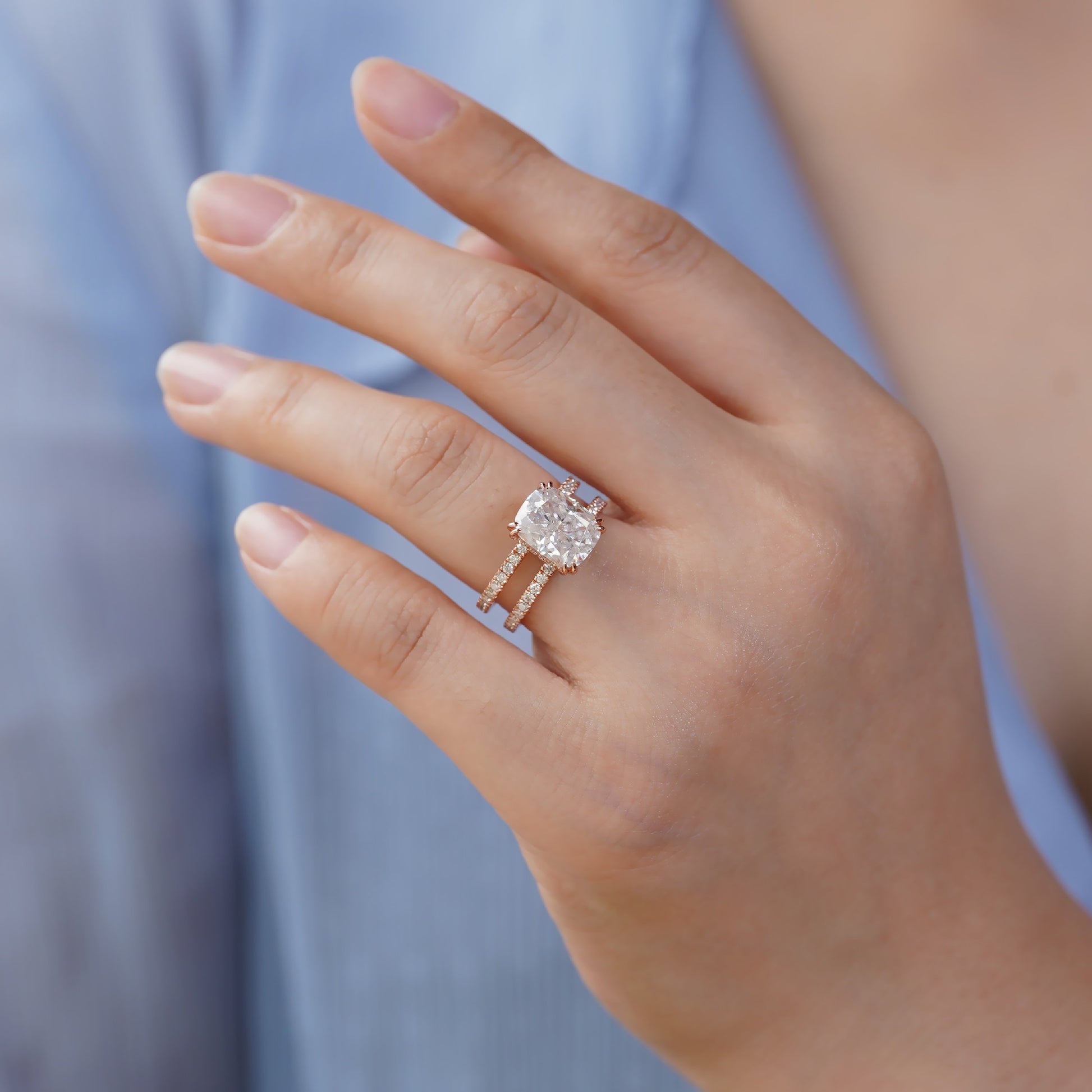 The Zahira ring features an incredible 3.5ct Crushed ice elongated cushion cut, which simply put, is one of the most stunning cuts available in moissanite. With beautiful clarity, this is a piece that will turn heads.