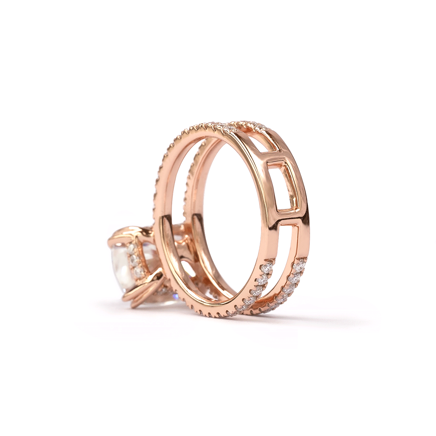 Our Zahira ring is a stunning piece from our double band collection, these rings are perfect for combining an engagement ring and wedding band into one, no fuss ring. This prevents the wedding band from slipping up or around, and makes sure it looks neat at all times.
